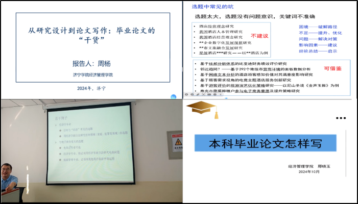 本次活动是经济管理学院本科论文指导系列工作之一,自9月份以来,经济管理学院组织邀请五位具备丰富论文指导经验的博士教师(邢晓玉、张冠甲、张超、周杨、李朕),精心录制“论文写作精品系列教程”视频面向全院师生共享,取得了积极效果,下一步经济管理学院将继续开展导师双选、集中开题等工作,狠抓毕业论文质量。