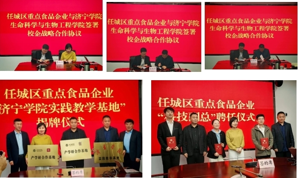 会上,大家共同观看了山东康泉食品有限公司、生命科学与工程学院食品科学与工程专业(中外合作办学项目)宣传片。李洪伟首先就任城区科技局精心组织的本次对接活动表示感谢,介绍了学院的专业设置、师资队伍和人才培养情况,并希望能够与地方食品企业加强产学研合作,在实习就业及成果转化等方面取得突破性成果。赵强分别与山东康泉食品有限公司、山东北速食品有限公司、济宁春蕾农业科技有限公司代表签署了产学研、实践教学基地合作协议,协议双方共同为基地揭牌。与会企业代表分别为王贝贝、丰宇、张业猛三位博士颁发了“科技副总”聘书,并就当前企业发展中的技术难题展开深入交流。