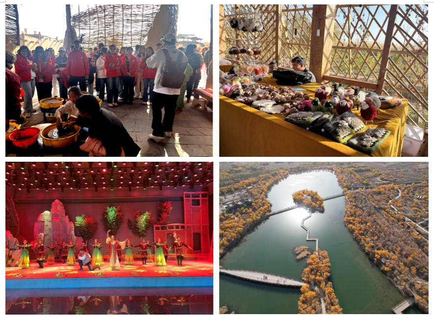 活动中,支教团师生认真聆听了工作人员对巴楚县红海景区的历史渊源、自然风光以及文化特色的简要介绍和对胡杨精神的细致讲解。随后,师生同乘区间车共览红海景区沿途风光,并在胡杨文化艺术剧院观看了以“胡杨文化”为主题的歌舞实景剧演出。景区内的新疆非遗文创产品展示展演让支教团感受到了非遗文化的魅力,更有同学亲身参与了非遗制作。通过沉浸式参观和体验,大家对新疆的多元文化和深厚历史有了更加深入的了解,同时坚定了他们为边疆贡献青春力量的决心。