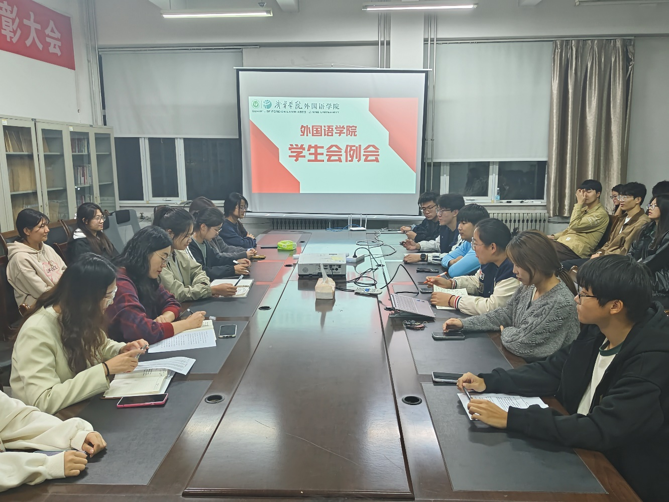 为深入学习宣传贯彻党的二十大和二十届二中、三中全会精神,进一步加强我院团委学生会建设,明确各部门职能和个人职责,10月31日,外国语学院于学院一楼会议室召开新一届团委学生会例会,学院党委副书记文灿、辅导员段明月出席此次例会,全体团委学生会干部参加。