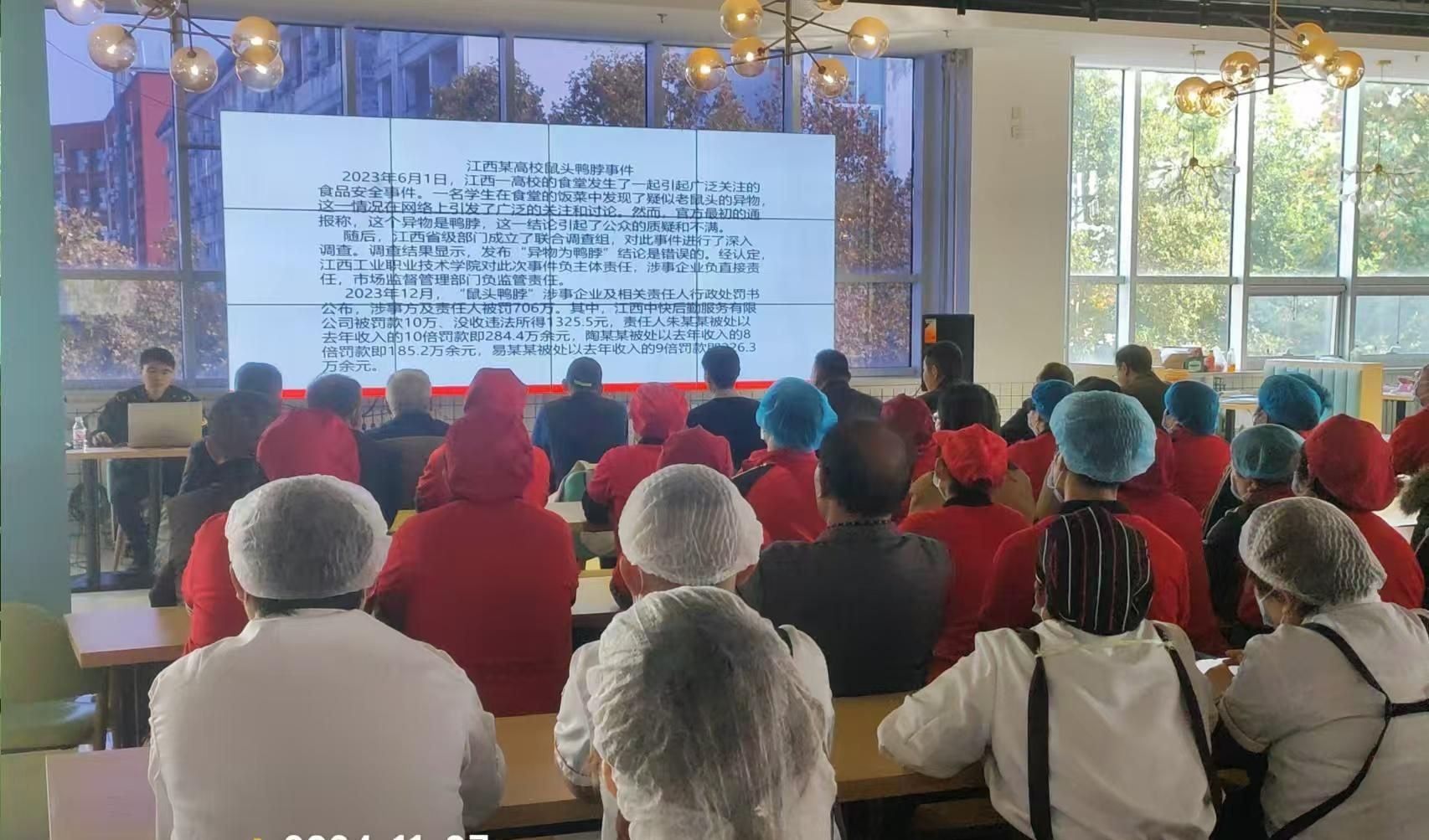 为进一步深化食品安全管理工作,消除食品安全风险隐患,增强从业人员食品安全意识,保障校园饮食安全。11月7日下午,我校邀请曲阜市市场监管局陵城镇监管所夏元洪所长一行3人来校检查指导食堂工作并开展专题培训。后勤管理与基建处处长刘忠建全程陪同,餐厅经理、食品安全总监、食品安全员、全体餐厅从业人员等共50余人参加了活动。