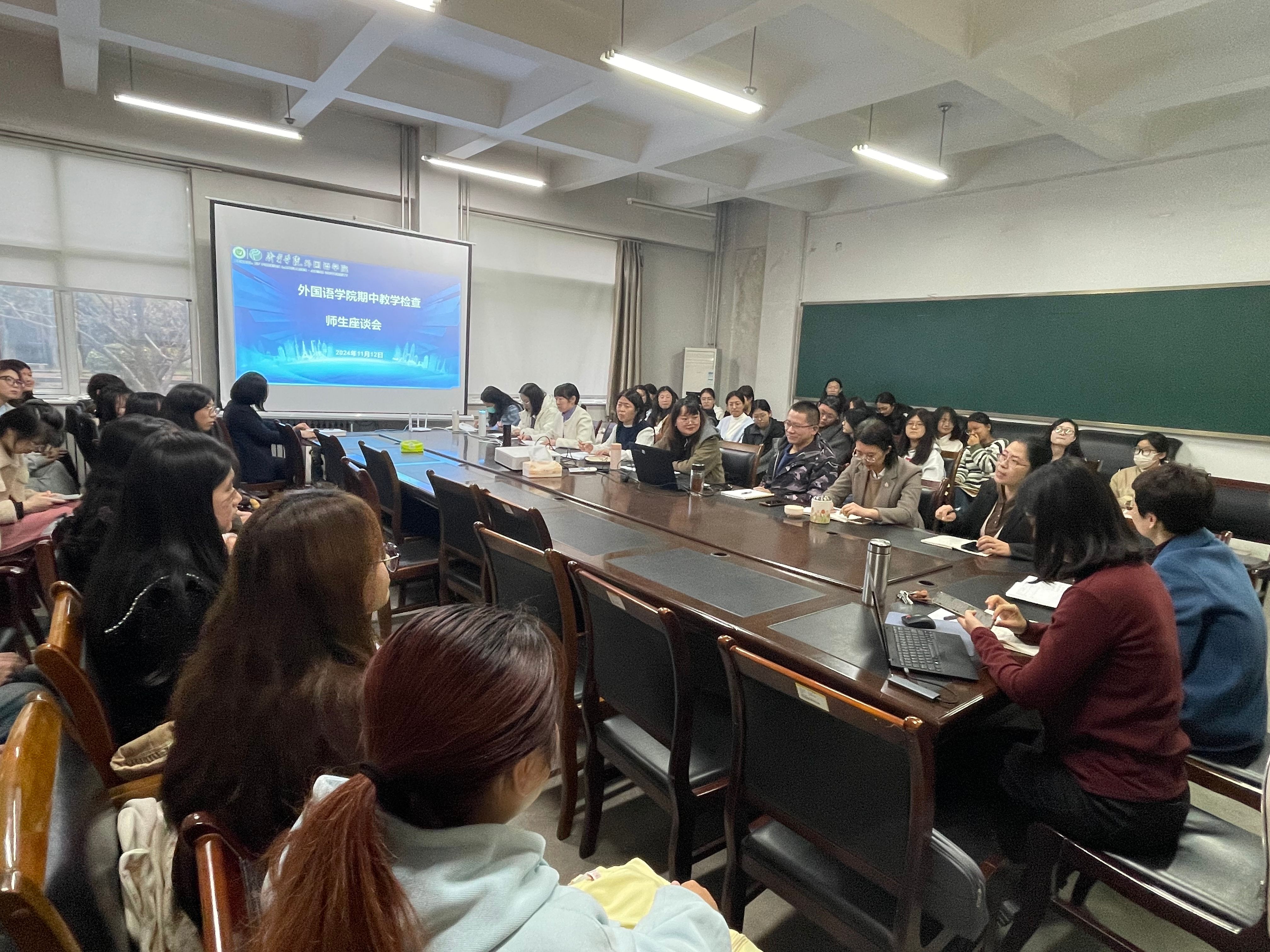 为深入了解教学状况,及时发现并解决教学过程中存在的问题,11月11日至12日下午,外国语学院分别在2#B102和3#A110举办了期中教学师生座谈会,围绕大学外语教学和专业教学进行了交流。学院学术副院长闫彩霞、范莉,教学科研秘书梁长超、张晶,英语系、商务英语系、大学英语教学部、多语种教学部负责人,教师代表,各学院各年级学委和学生代表参加了会议。会议由梁长超主持。