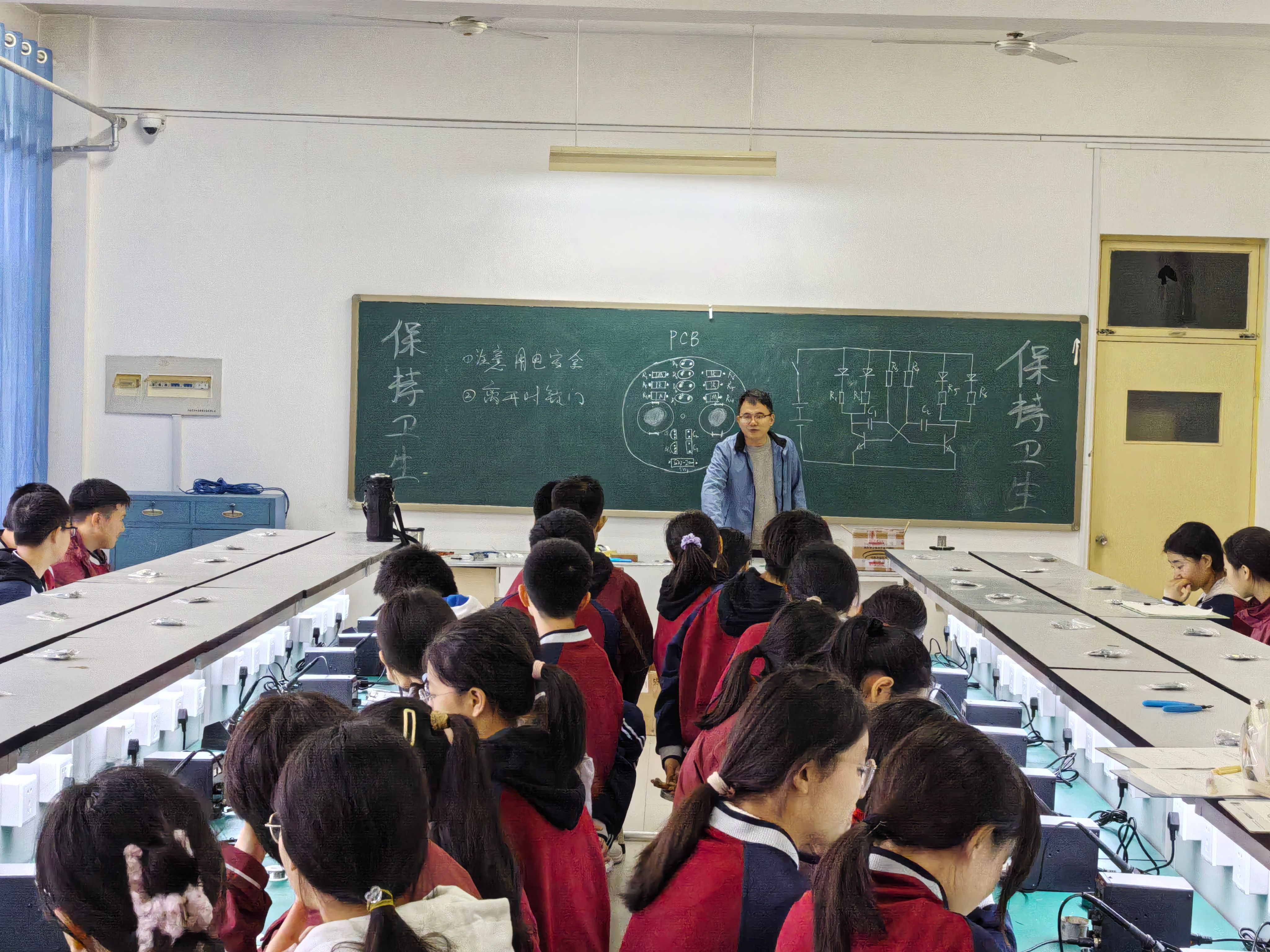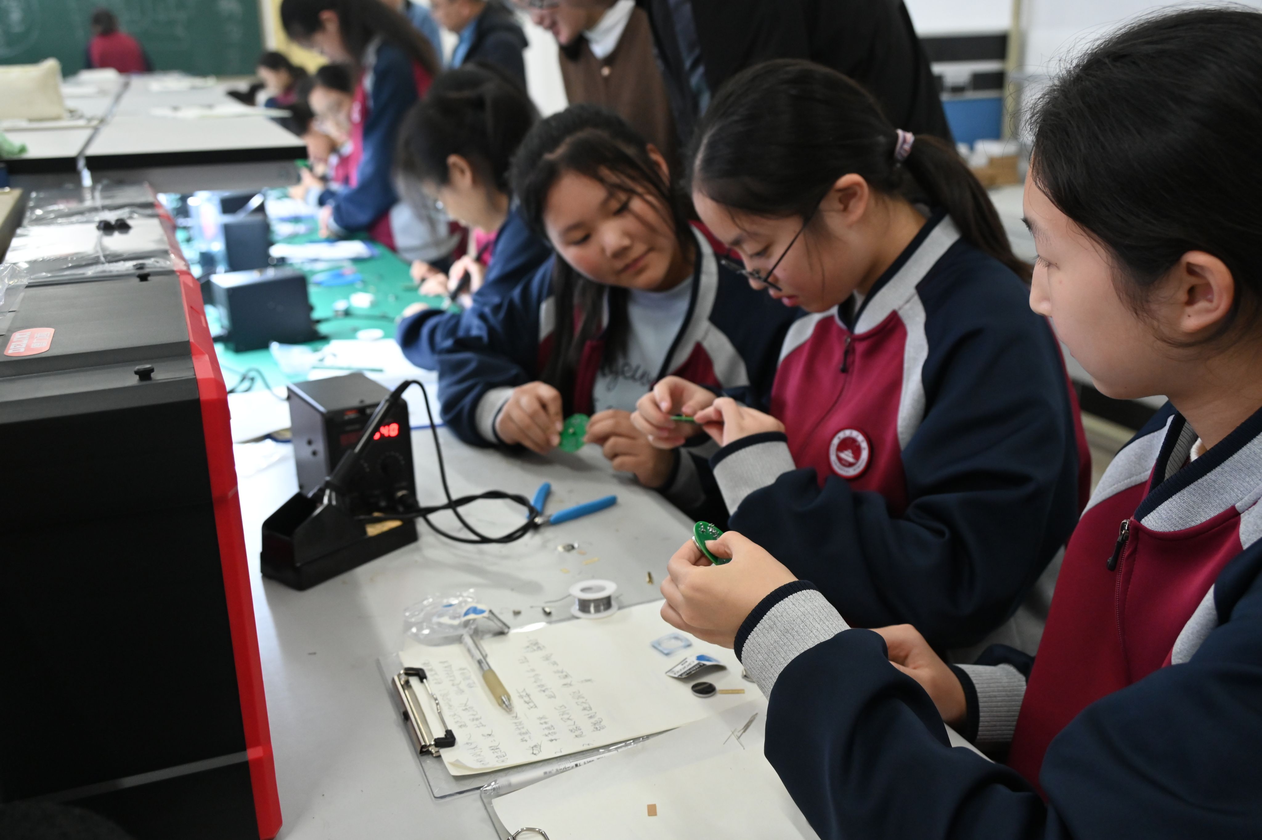 随后,学生们分组进入了物理创新实践环节,进行了LED旋转陀螺焊接等实践活动。通过实践深入了解了电磁学、动力学等物理知识。这一过程不仅锻炼了学生们的动手能力,还激发了他们对物理学科的兴趣和热爱。