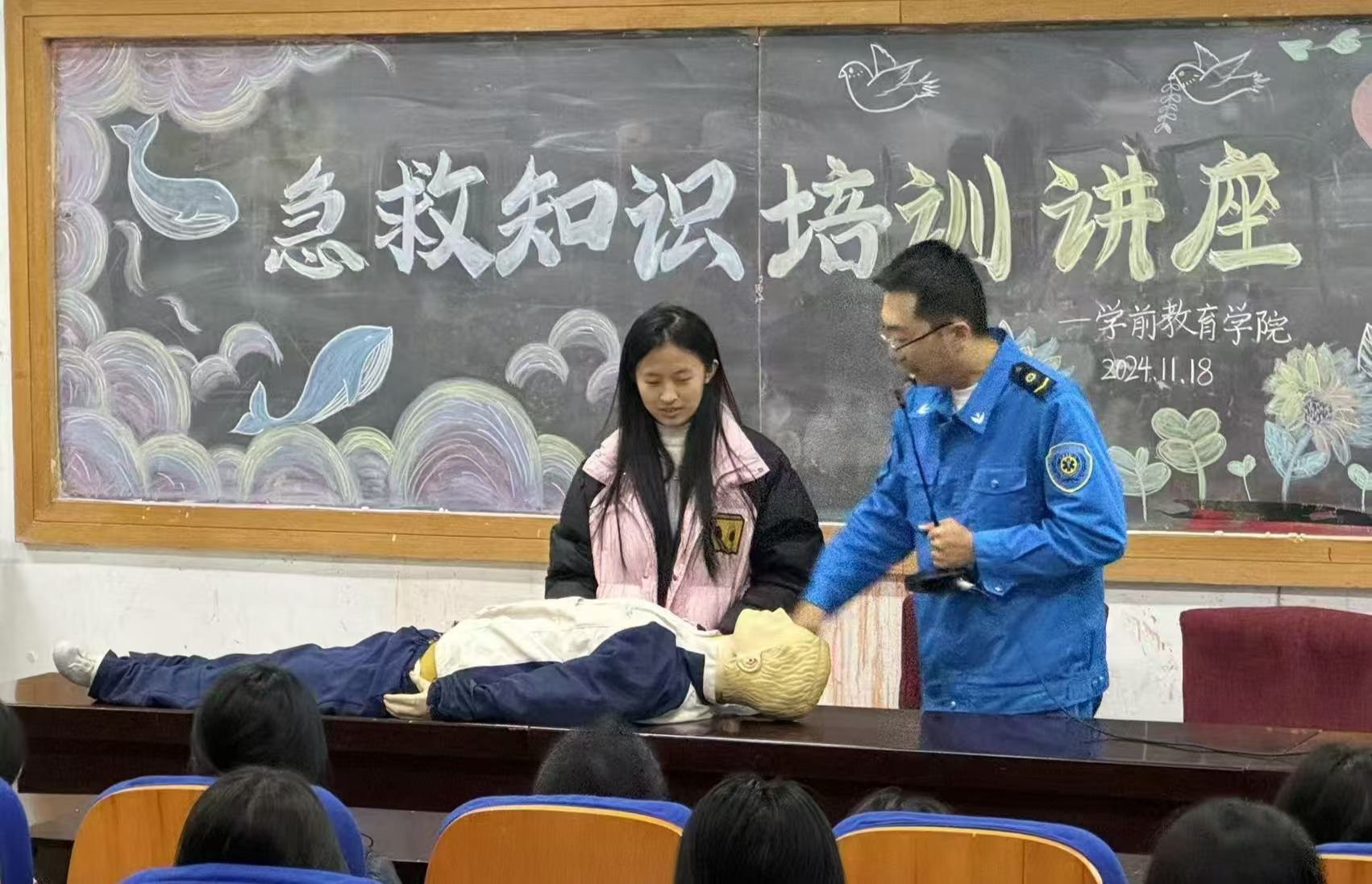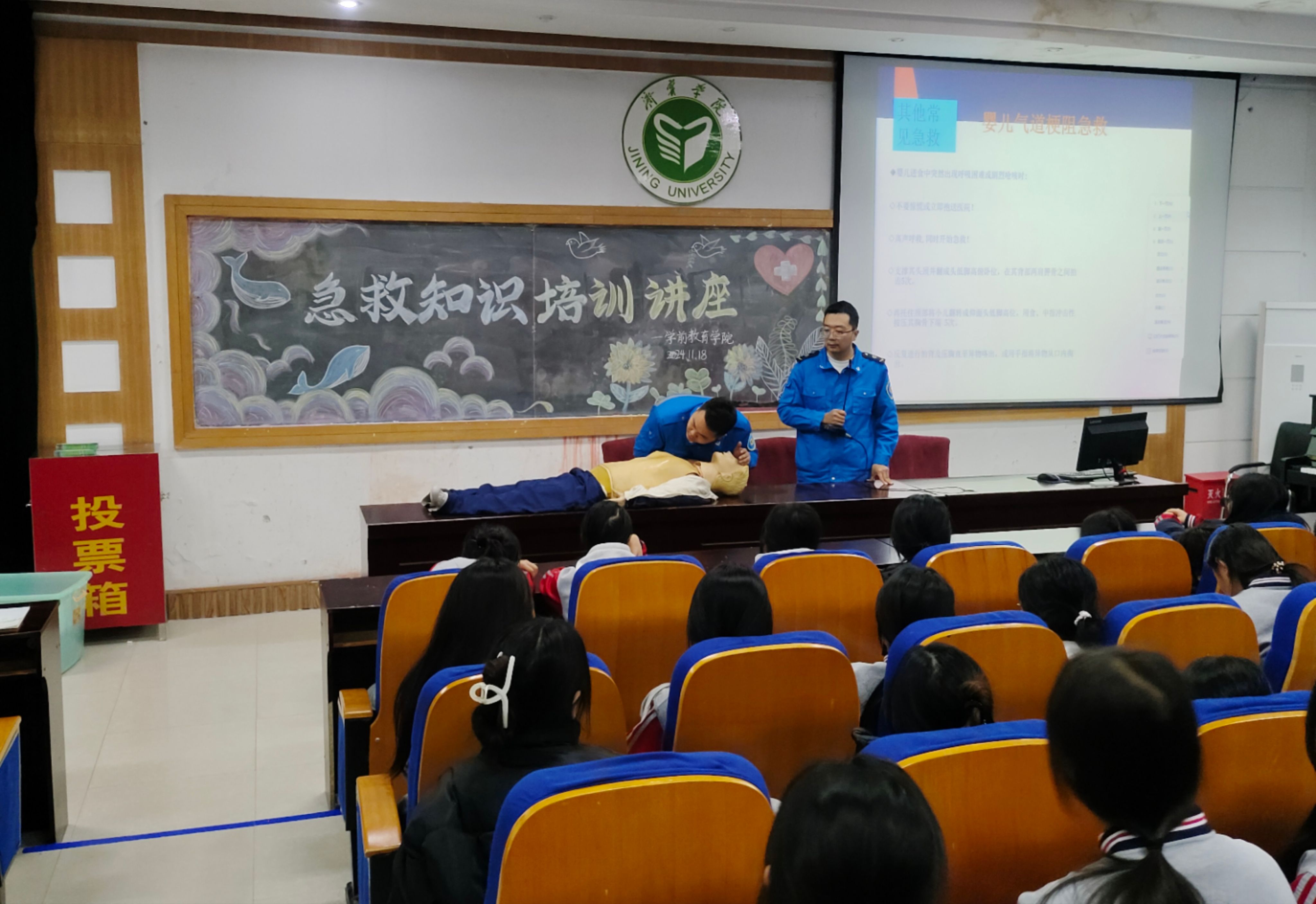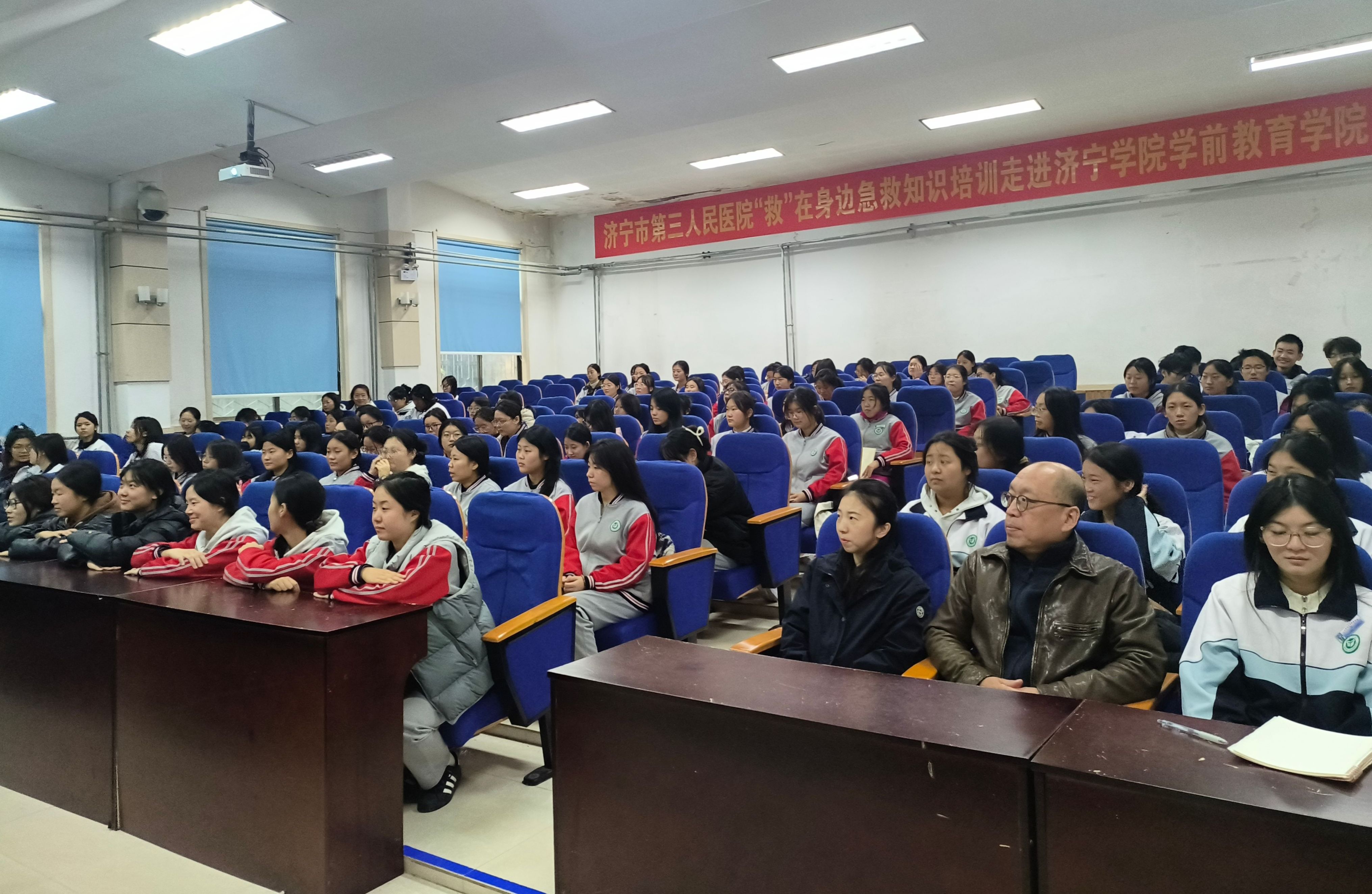 为提高师生们的急救意识和应急处理能力,11月18日下午,学前教育学院成功举办 “‘救’在身边”急救知识培训,特别邀请济宁市第三人民医院急救中心医生靳龙飞、张振现场授课。