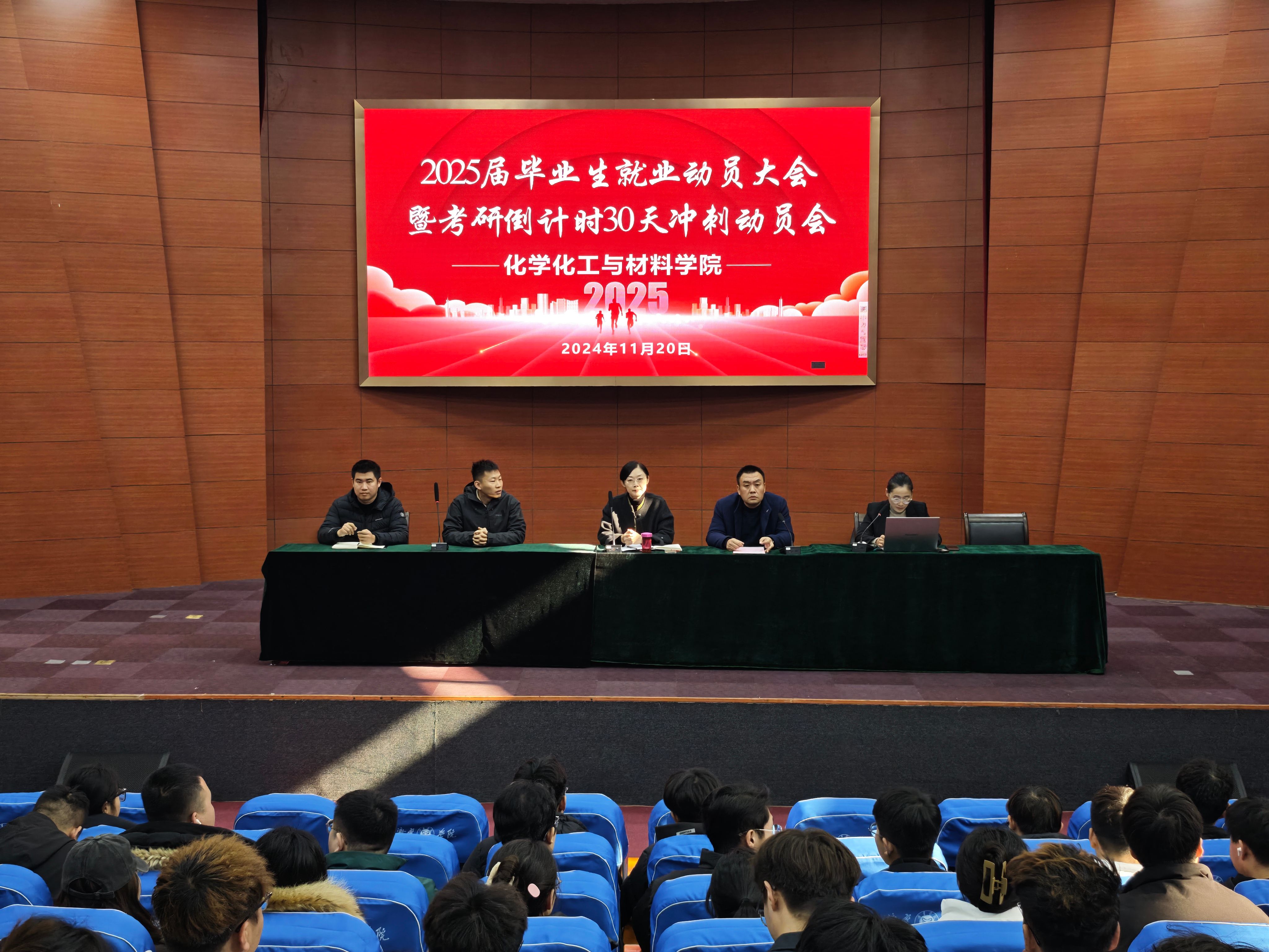 11月20日上午,化学化工与材料学院在理科楼报告厅召开2025届毕业生就业动员大会暨考研倒计时30天冲刺动员会。学院党委书记马新蕾、院长刘涛、团委书记李文婷、辅导员李天乐、张正弛以及留学服务中心的老师出席会议。全体2025届毕业生参加会议。