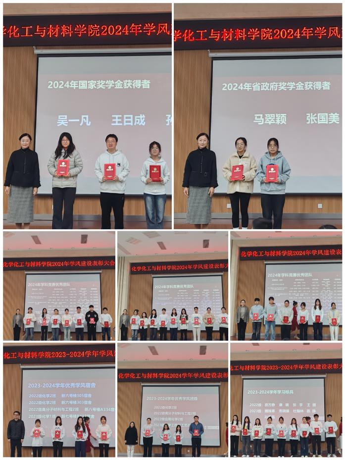 大会首先对2023至2024学年学风建设先进集体和个人进行表彰。此次表彰的类别包括综测优秀个人、学习标兵、优秀学风宿舍、优秀学风班级、获省级以上学科竞赛奖励的个人和团队,以及国家奖学金、省政府奖学金获得者。