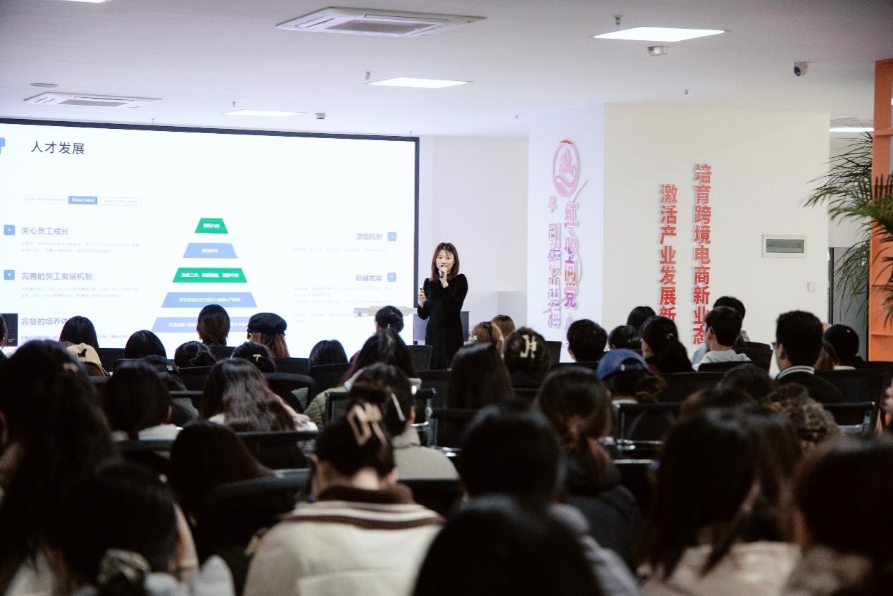随后,苏安琪详细介绍了易运盈的创立背景、业务模式和信息化建设情况。她强调,作为一家年轻而充满活力的互联网公司,易运盈不仅注重业务的发展,还积极履行社会责任,致力于推动济宁市十二个县区的经济发展,提供专业的培训和支持。此外,苏安琪还分享了公司在人才孵化、员工关怀和企业文化建设方面的努力,展现了公司对于员工幸福感、工作生活平衡及情绪价值的高度重视。