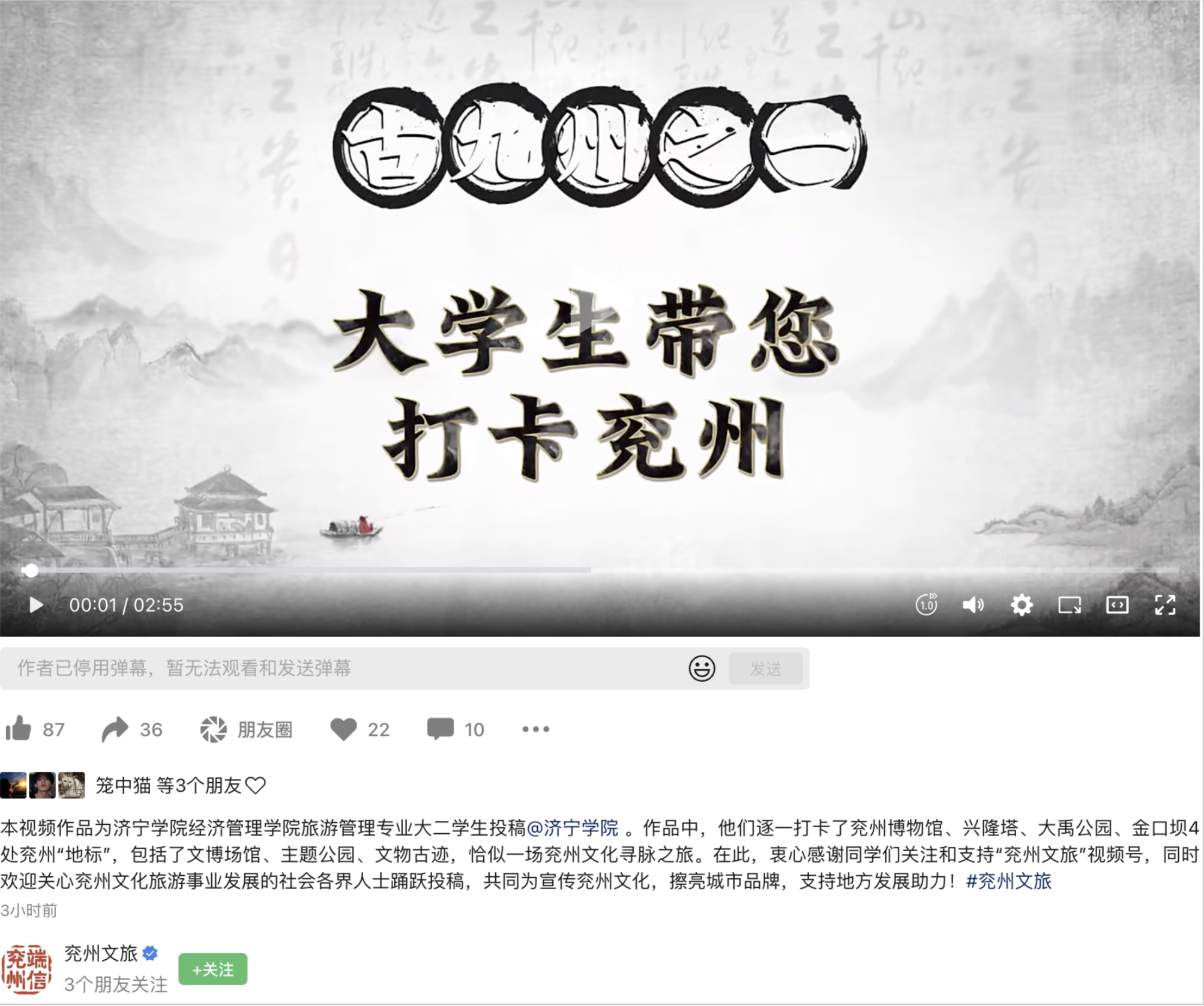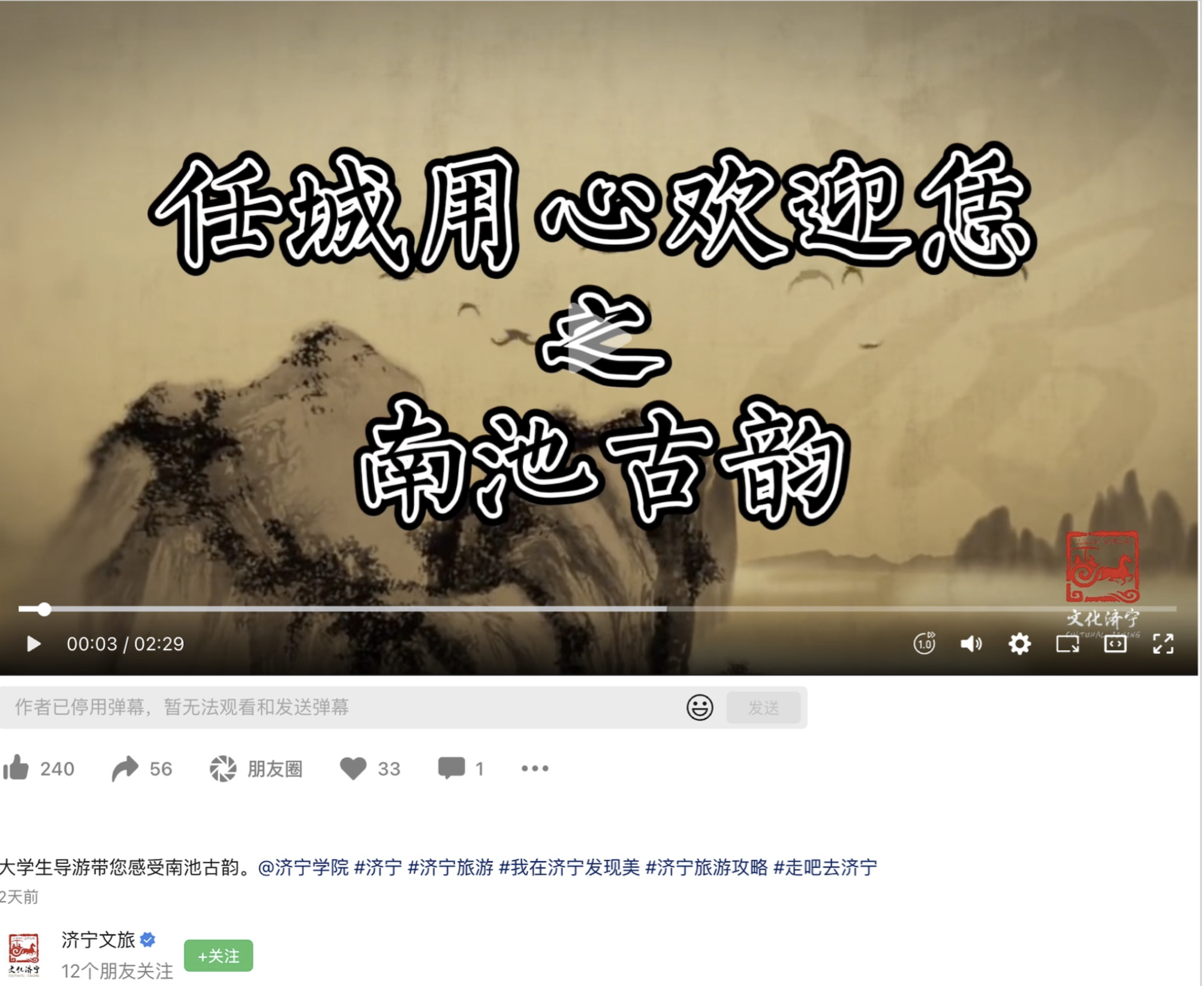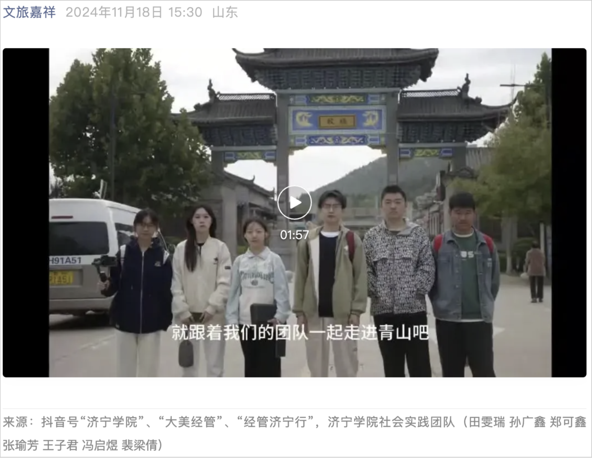 同学们拍摄的视频作业因别出心裁的创意、有趣的文化内容,短时间内强势出圈,先后被济宁文旅、任城文旅、曲阜文旅、嘉祥文旅、汶上文旅、微山文旅、兖州文旅等官方账号转发,系列视频获得广泛关注与众多好评。