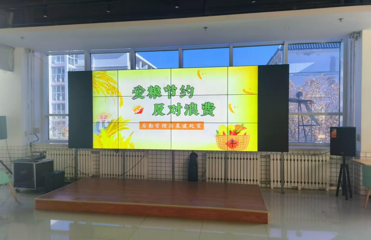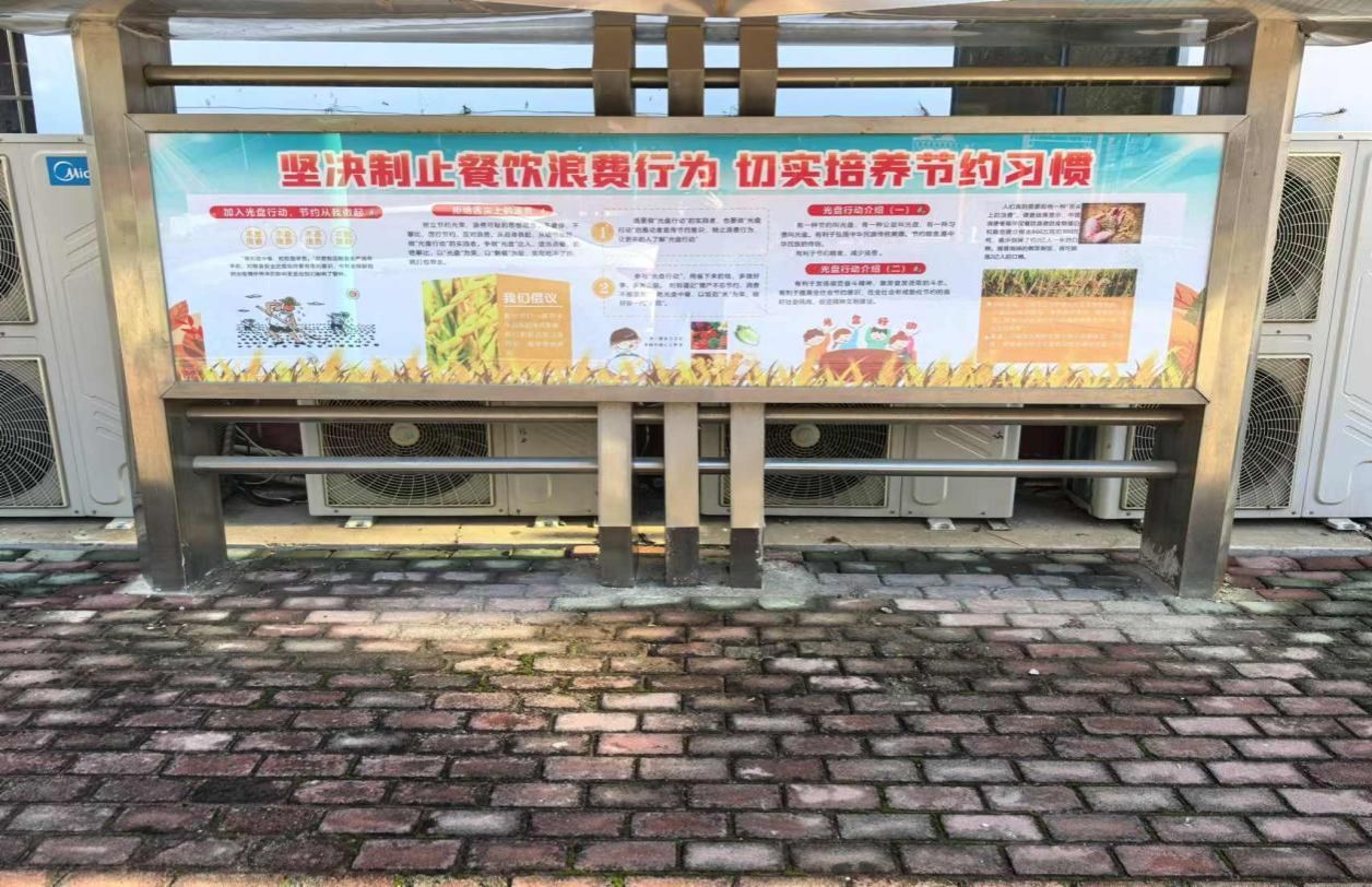 广泛宣传,积极营造节约氛围。学校在宣传栏精心设计张贴了制止餐饮浪费宣传海报,在餐厅前广场显著位置悬挂“爱粮节约 彰显大学文明”条幅,在餐厅循环播放“粮安天下”等宣传视频,让节约教育在学校随处可见,让大家对爱粮节粮有更深入认识,进一步营造爱粮节约浓厚氛围。