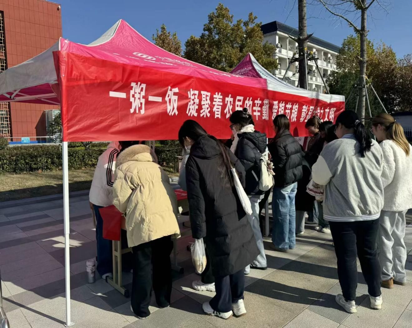 交互体验,引导师生参与节约行动。为增强互动性,学校在广场设置爱粮节约宣传驿站,发起签名倡议,过往师生纷纷在横幅上签字,将珍惜、节约粮食的口号内化于心,彰显捍卫粮食安全、倡导绿色生活的崇高使命与坚定决心。