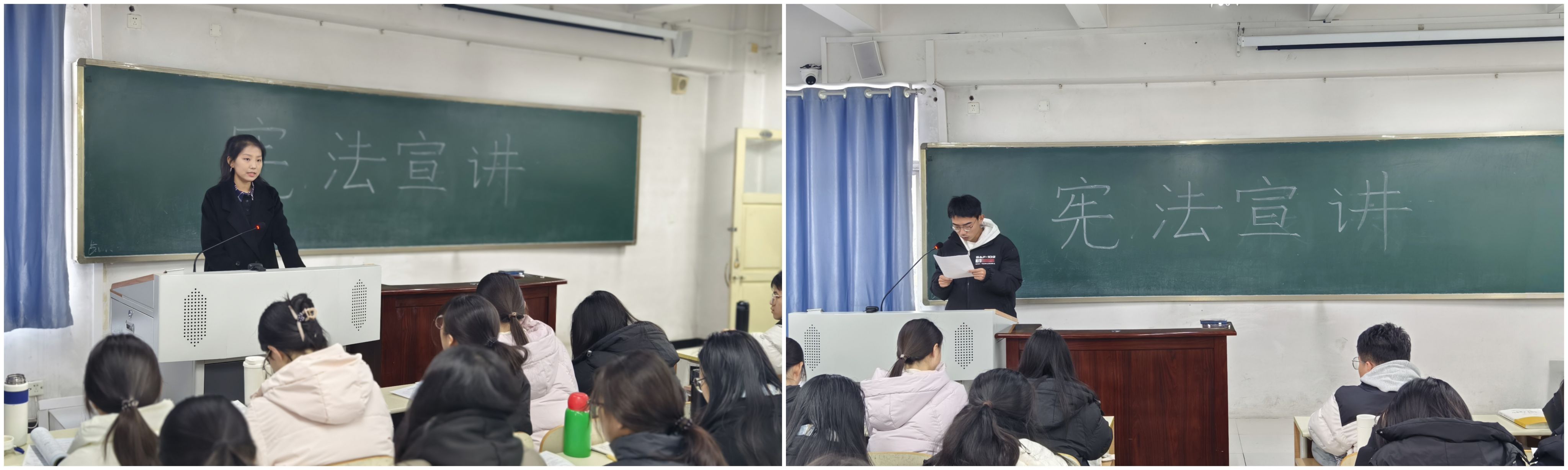 开展宪法宣讲。两位学生作了《学习宪法核心价值观,做时代新青年》《学习宪法知识,构建法治社会》的主题宣讲,分享宪法规定的关键要素对国家治理、人民福祉和社会发展的重要性,呼吁大家认真学习宪法,明晰自身权利义务并尊重他人,积极遵守、维护宪法权威与稳定,以保障国家长治久安和人民幸福安康。