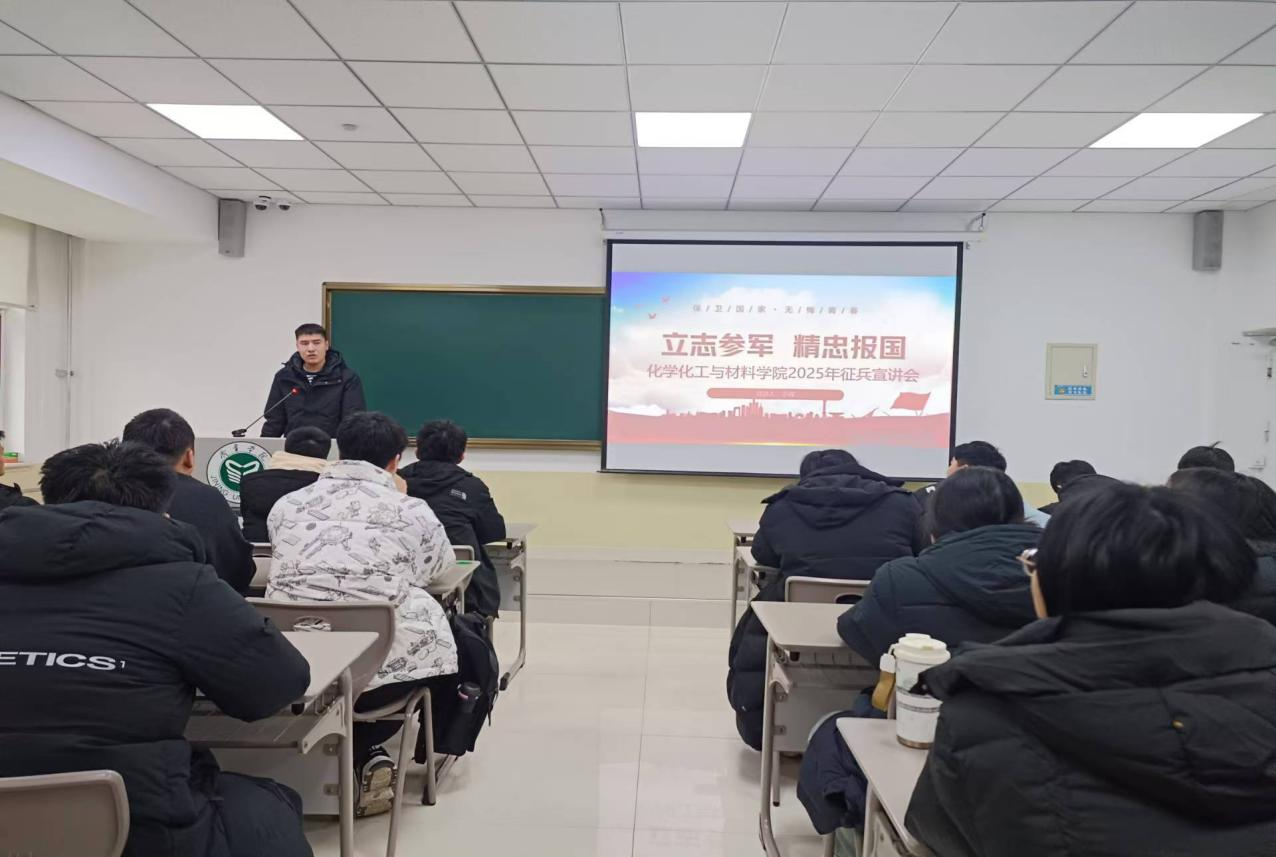 12月12日,化学化工与材料学院开展“立志参军,精忠报国”2025年大学生征兵宣讲会。学院党委书记马新蕾出席活动,辅导员高峰及学院征兵宣讲团进行主题宣讲,各年级有意参军的同学们积极参与本次宣讲会。会议由学院辅导员丰雪情主持。