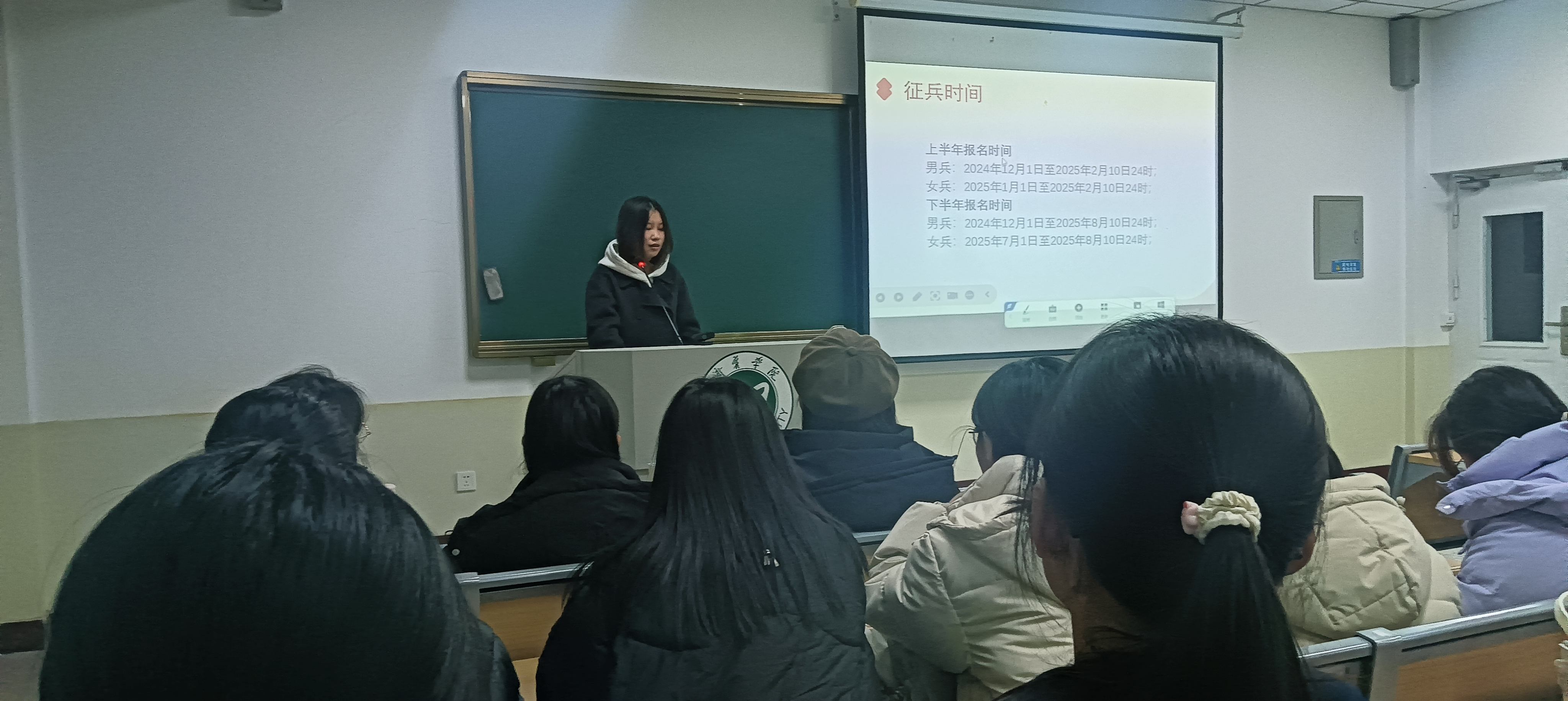 为积极响应国家号召,增强大学生国防意识,鼓励更多学子投身国防事业,12月18日晚,外国语学院在2A306举办征兵入伍宣讲活动。本次宣讲邀请退役大学生士兵代表、2024级英语1班张入月同学做分享,2025届毕业班男生及有意向参军入伍同学参加。活动由辅导员冯占磊主持。