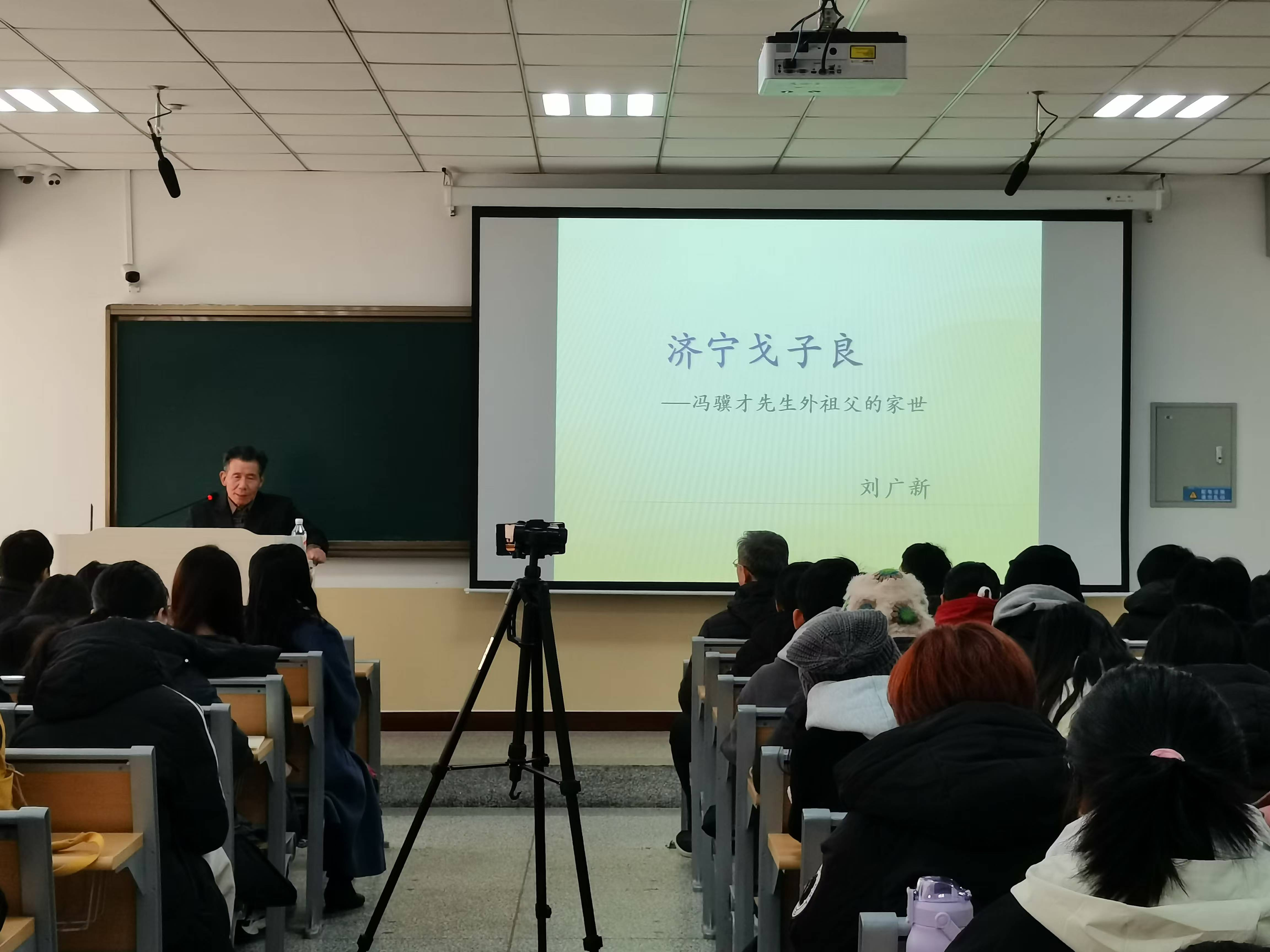 12月19日下午,人文与传播学院“东山讲坛”第12期邀请济宁市河道总督署展示馆名誉馆长刘广新先生,作了题为《济宁戈子良——冯骥才先生外祖父家世考》的学术讲座。讲座由该院副院长张颖慧博士主持,吸引了众多文学爱好者和文史研究者前来参加。该院100余名学生现场出席讲座会。