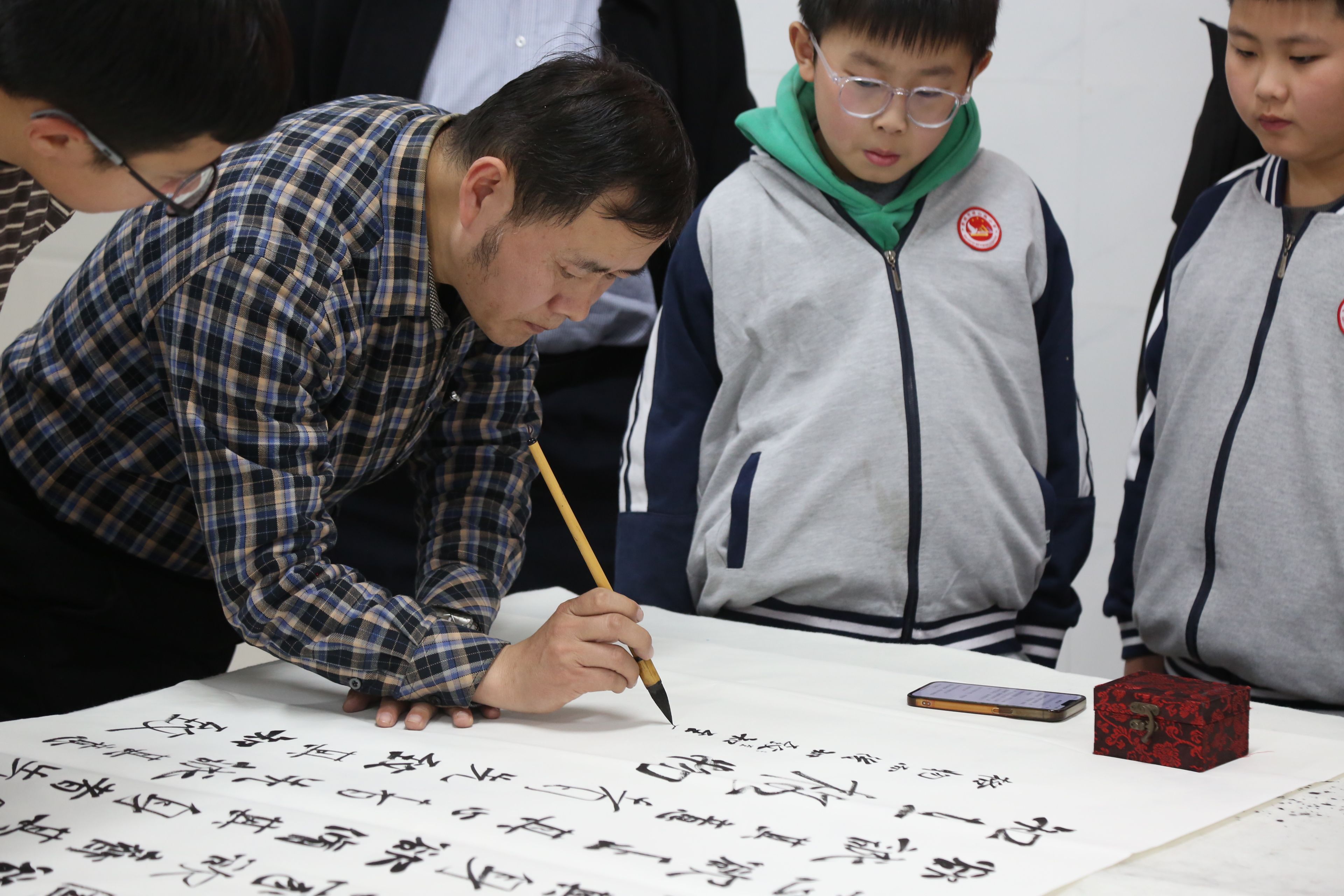 在美术课程之后,参与活动的书画家共同创作,并为现场观摩的学生讲解书画的基本知识和技巧,让孩子们对书画艺术有了更直观的认识。