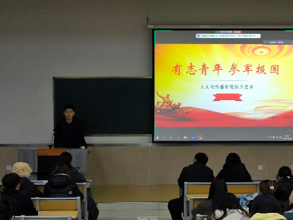 肩扛使命赴戎机,心怀壮志卫山河。为进一步宣传国家征兵政策,激发大学生参军入伍的热情,12月23日,人文与传播学院在二号楼B201举办了“有志青年,参军报国”大学生征兵宣讲活动,学院团委副书记张甜、退役大学生、毕业年级全体学生及有意向参军入伍同学参加,活动由学院辅导员张雅靖主持。