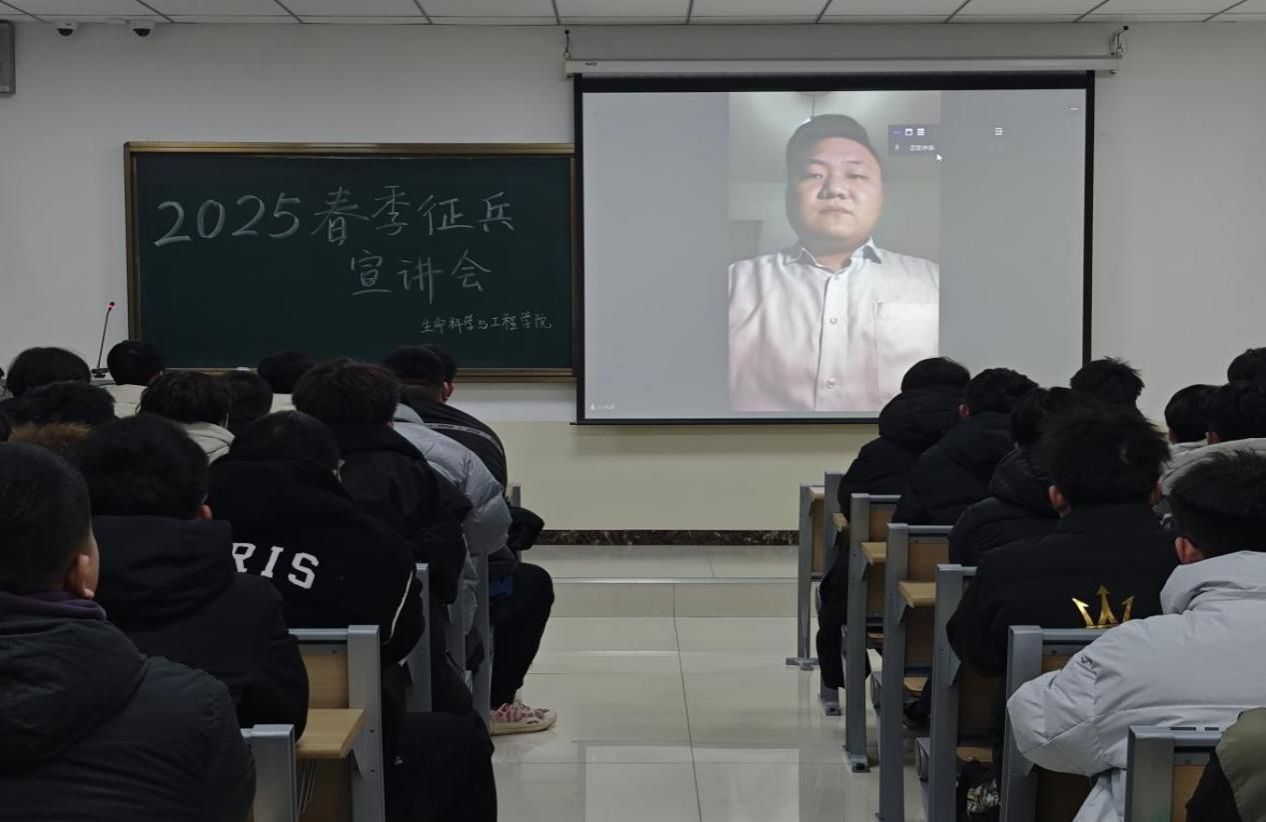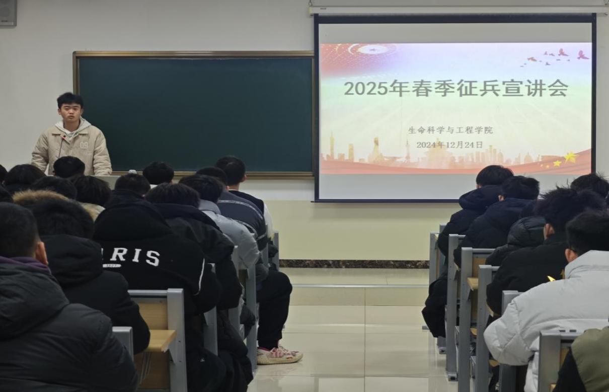 12月24日,生命科学与工程学院在9号楼A405教室举办2025年春季征兵宣讲会。宣讲会邀请退役士兵代表学生刘林、张海潮作宣讲,学院辅导员马泽瀛主持,2025届毕业生及有参军入伍意向的非毕业班学生代表参加。