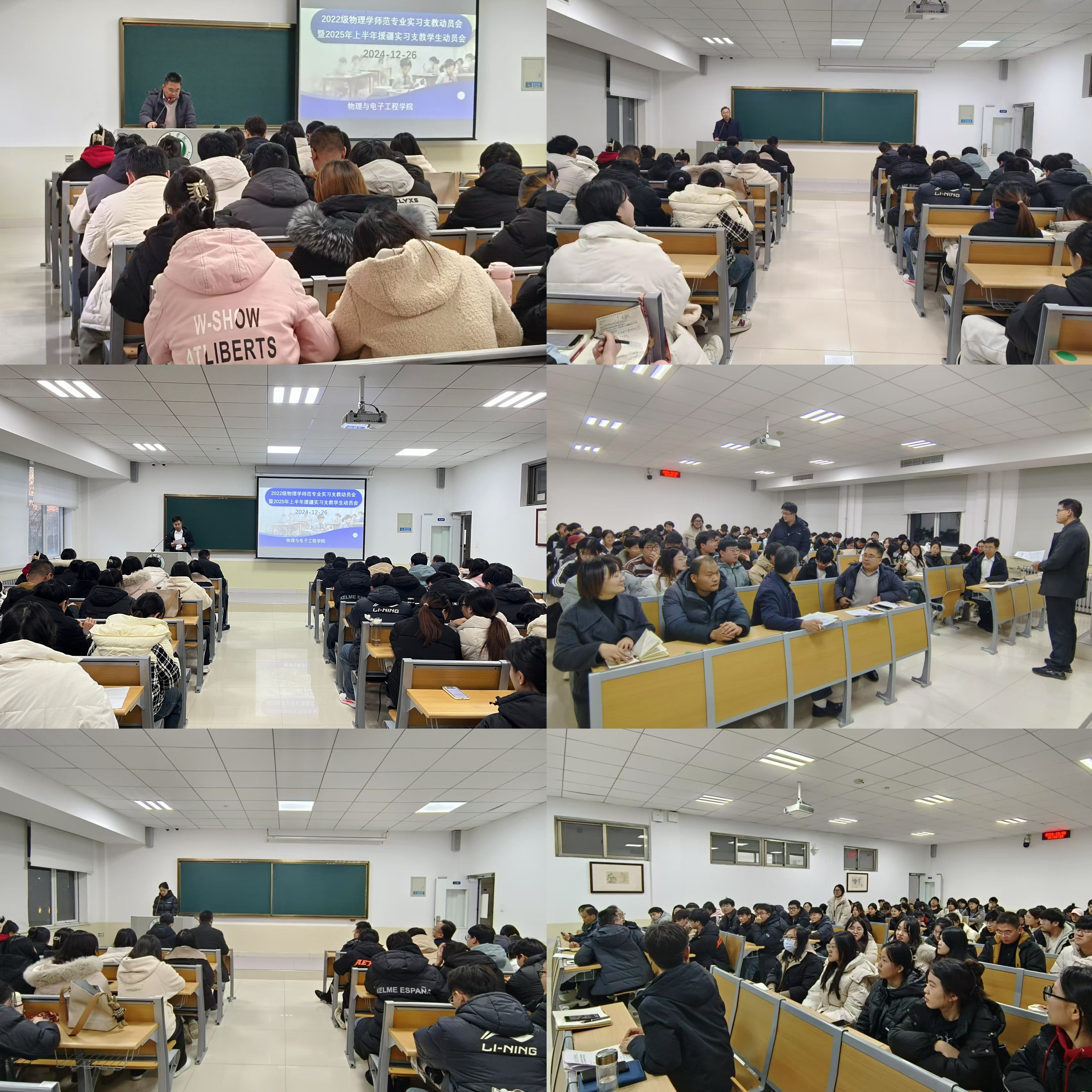 12月26日下午,物理与电子工程学院在9#A205智慧教室开展2025年上半年援疆实习支教学生动员会。学院党委书记卫建勋、副院长岳现房、物理系主任赵建华、系副主任、辅导员、班主任、2021级援疆支教实习代表、优秀实习生代表、2022级物理学师范专业全体同学等参加。会议由物理与电子工程学院党委副书记李洪波主持。