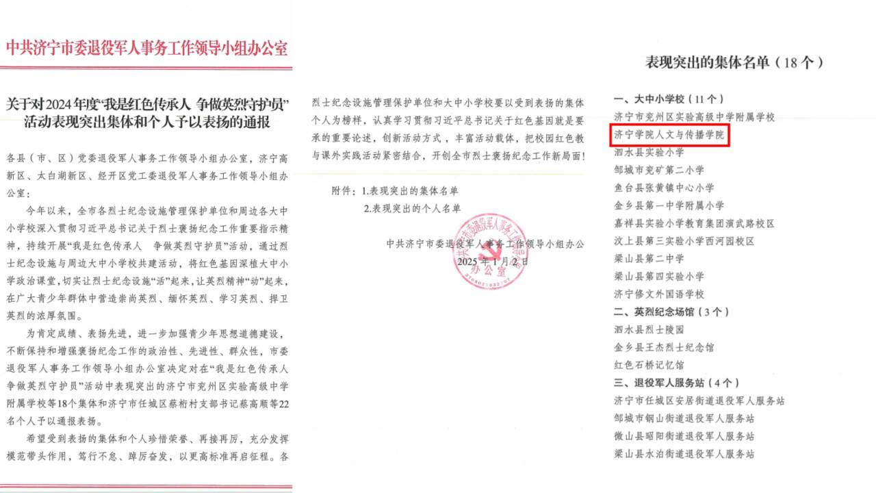 近日,中共济宁市委退役军人事务工作领导小组办公室下发了《关于对2024年度“我是红色传承人 争做英烈守护员”活动表现突出集体和个人予以表扬的通报》,授予我校人文与传播学院“2024年度‘我是红色传承人 争做英烈守护员’活动表现突出集体”荣誉称号。