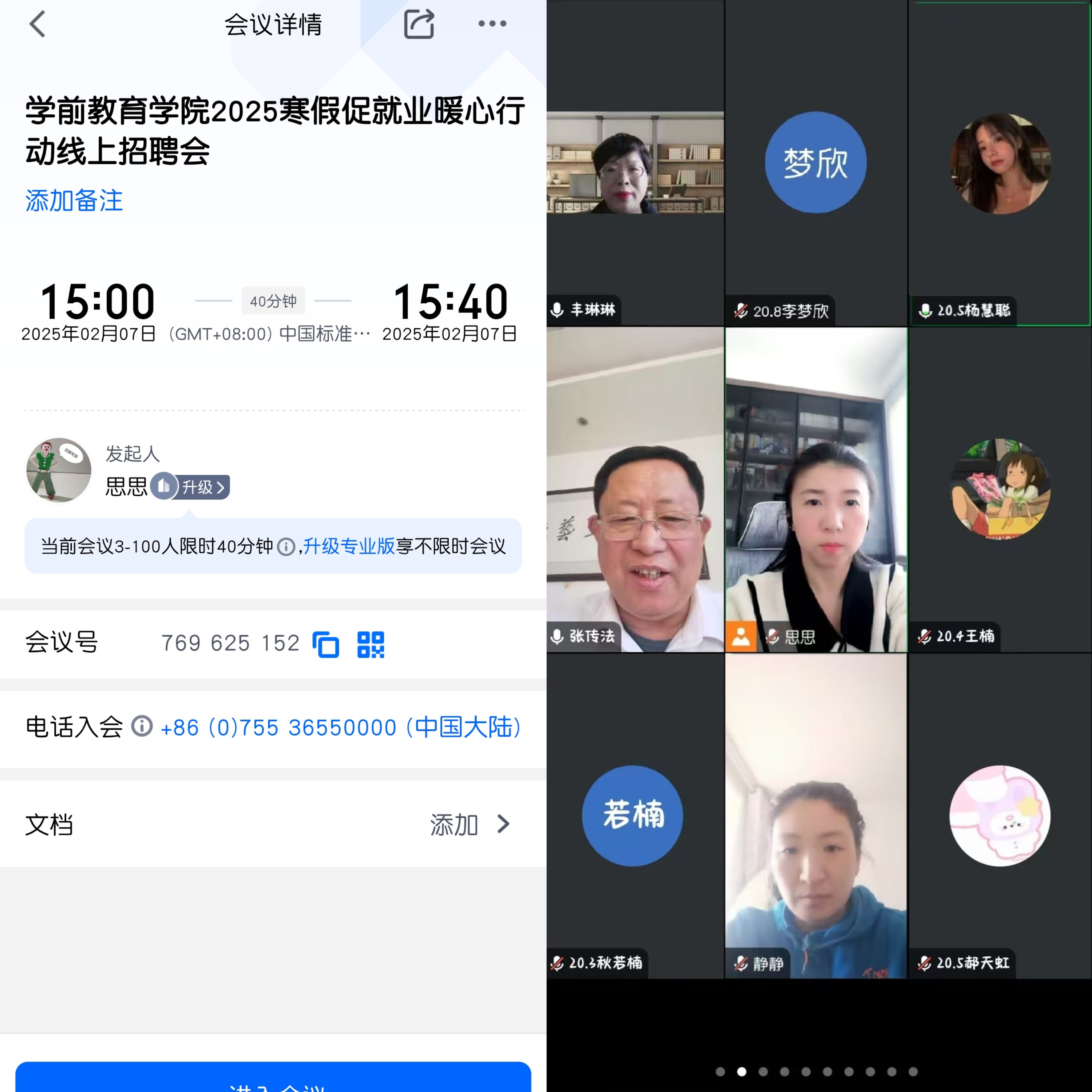 为积极响应教育部关于高校毕业生就业工作的相关部署,充分利用寒假窗口期,为学前教育学院2025届毕业生提供更多就业机会,2月7日下午,学前教育学院举办“寒假促就业暖心行动”线上招聘会,为毕业生求职就业搭建了良好平台。2025届全体毕业生、毕业班辅导员、招聘单位代表参加会议。此次招聘会由学前教育学院党委副书记丰琳琳主持。