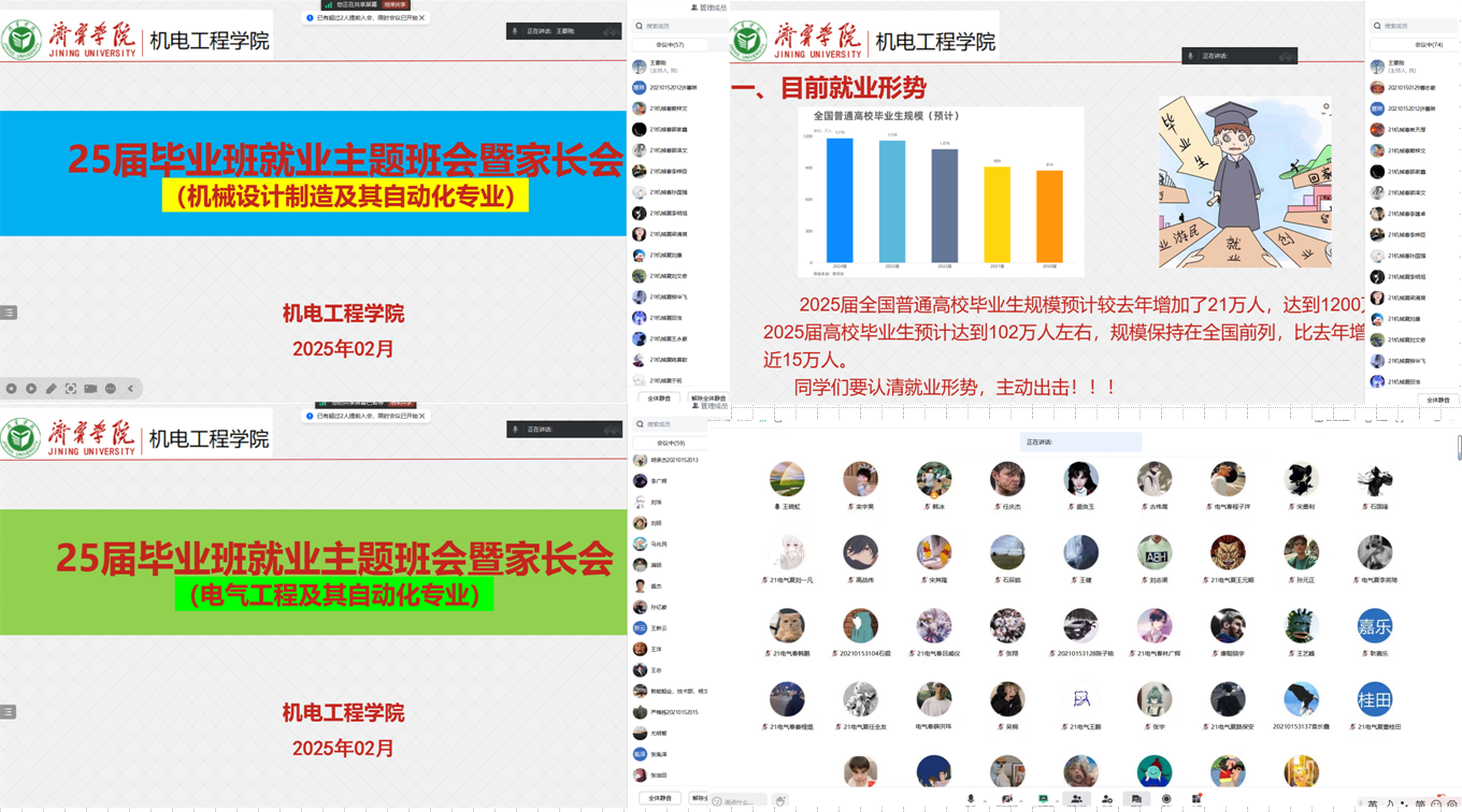 为进一步优化就业指导服务,机电工程学院积极开展“寒假促就业暖心行动”,帮助毕业生解决求职就业中的问题,促进毕业生早就业、就好业。2月13日,机电工程学院分专业组织召开了2025届毕业班线上家长会。会议由毕业班辅导员主持,全体毕业生及家长参加。