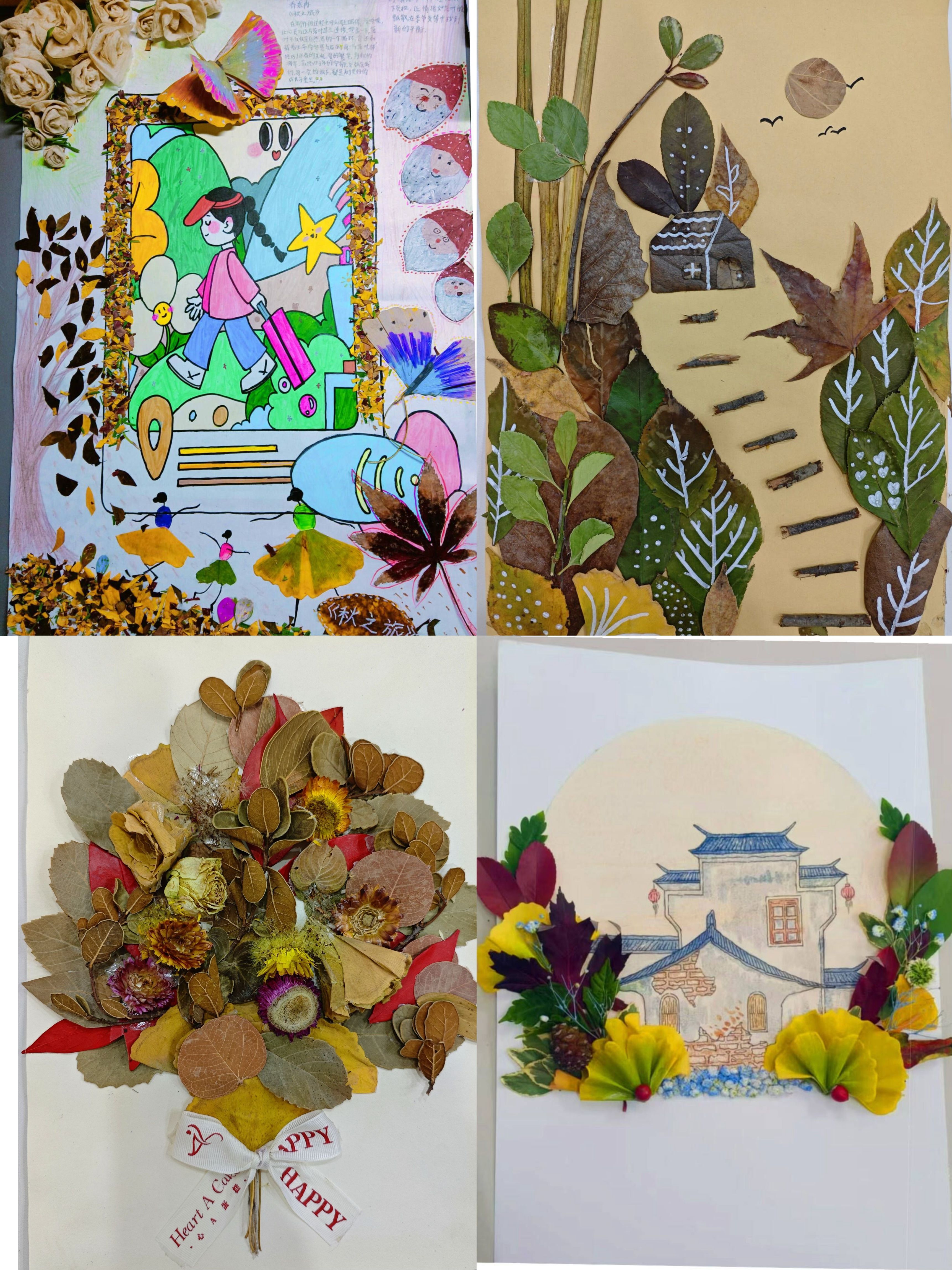 入选展示的四项作品分别是初等教育学院乔东冉创作的《秋之旅》、经济管理学院王佳月和管群创作的《树深时见“路”》、初等教育学院杨涵创作的《秋天的礼物》以及美术学院张琛创作的《静心》。同学们用灵巧的双手,以落叶、花瓣、树枝等为素材,在自然、艺术与创意的美妙邂中,以秋入画,以画话心,赋予落叶崭新的生命与意义,感悟生命的美好,寻觅心灵的宁静,沉淀自我疗愈的力量。