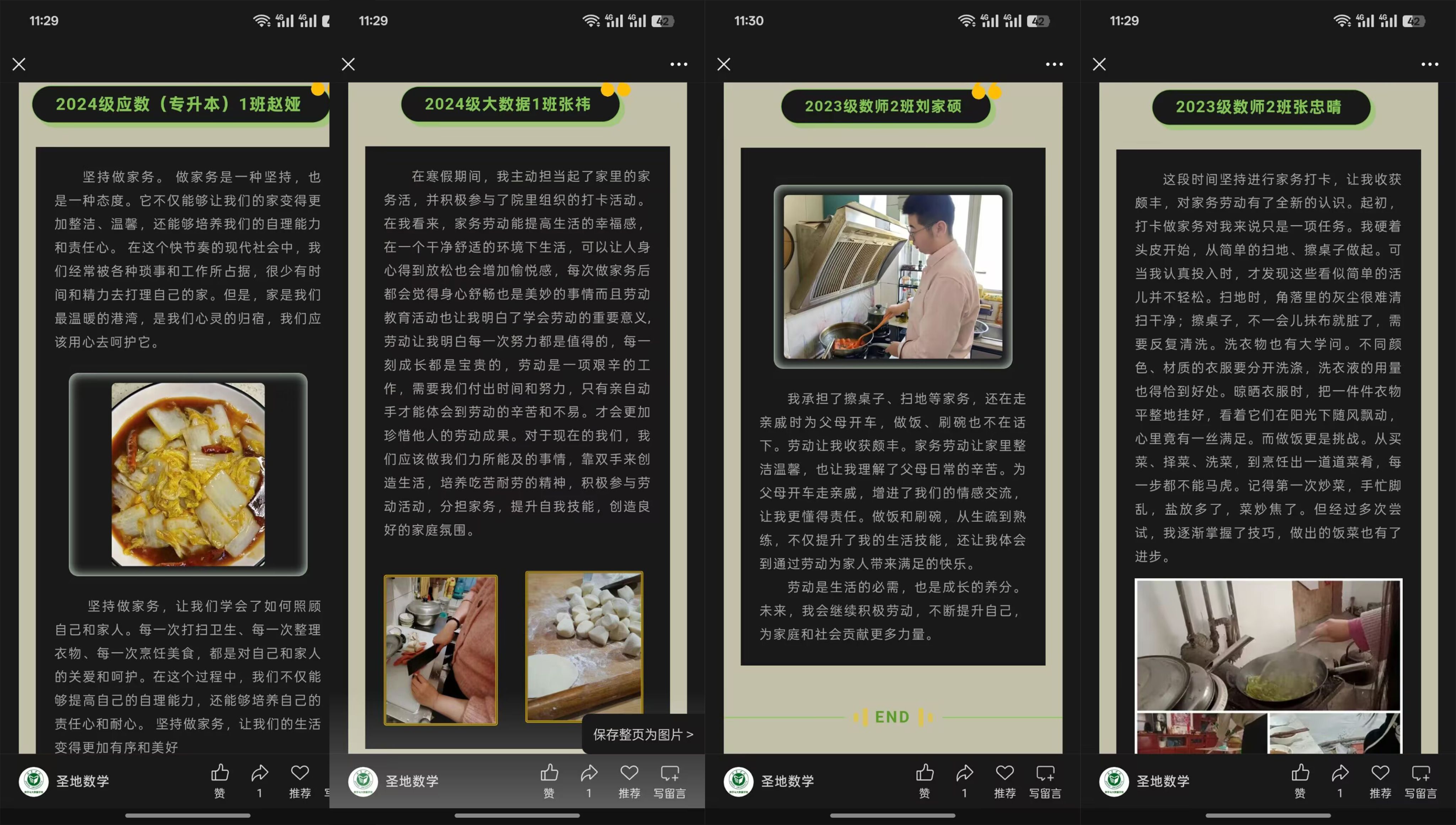 活动分成自习打卡、家务打卡两部分,同学们可以自行选择。自1月15日启动以来,参与者需每天通过指定平台上传自习照片、学习记录,或是家务劳动照片,完成打卡任务并在活动群内分享心得。活动吸引全学院200余名同学参与、提交2000余份打卡记录。在自习打卡中,同学们自主设计学习进度和内容,涵盖了专业课程复习、教师资格证备考、编程技能提升、英语学习等,并根据打卡完成情况评选出“自律达人”。在家务打卡中,有的同学下厨做饭、有的同学打扫卫生,利用家务劳动的形式,向家人表达爱的同时,更是在培养自己的独立生活能力、养成良好生活习惯。活动结束后,在学院官方微信公众号上对大家的打卡情况进行了展播。