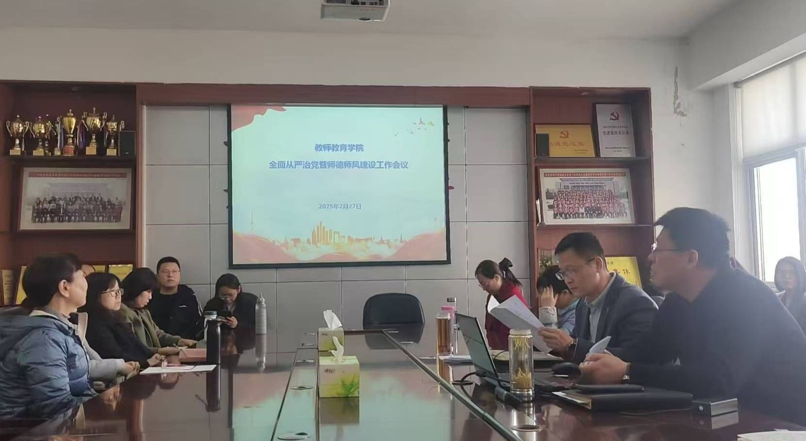 为进一步凝心聚力,扎实推进2025年重点工作任务,2月27日下午,教师教育学院在2号楼A211会议室召开全面从严治党暨师德师风建设工作会议。会议由该院党委书记刘勇主持,学院领导班子及全体教职工参加会议。