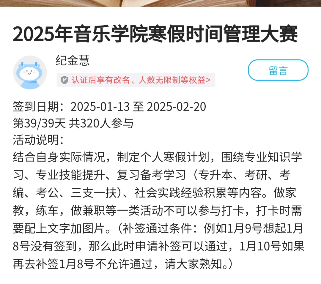 近日,音乐学院举办的“冬日暖阳下的时光交响”寒假时间管理大赛正式落下帷幕。本次大赛以“寒日逐梦,不负时光”为主题,旨在引导同学们合理规划寒假生活,实现知识增长、专业提升与自我成长,为同学们的寒假生活增添了一份别样的精彩。