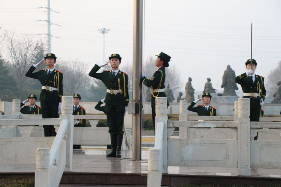 早上7点,学校大学生国旗护卫队迈着铿锵有力的步伐,护送国旗入场。随着激昂的国歌奏响,鲜艳的五星红旗在晨曦中冉冉升起,全场师生齐唱国歌,行注目礼。