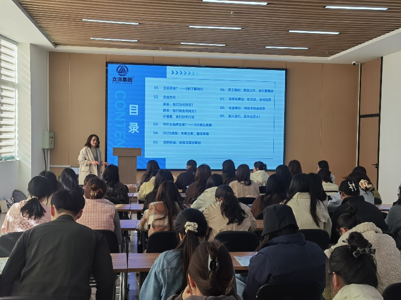 宣讲会上,乔元清向在场的毕业生们全面介绍了立派集团的企业文化、业务范围以及未来发展前景。她通过生动的案例、详实的数据,让同学们对应聘岗位有了更为清晰的认知。在介绍过程中,嘉宾们还特别强调了对应届毕业生的培养计划和职业发展路径,鼓励同学们积极投身职场,实现个人价值与企业发展的双赢。
