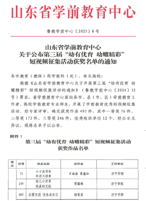 根据《山东省学前教育中心关于开展第三届“幼有优育公力耀精彩”短视频征集活动的通知》(鲁教学前中心[2024]32号)要求,省学前教育中心面向各市、县(市、区)学前教育工作者、高校学前教育专业师生,开展了学前教育优秀短视频征集活动。学前教育学院师生积极参与,取得佳绩。丰琳琳、姜鑫如《小小发明家,科技大探索》荣获一等奖, 贾儒晴《幼儿小世界,纯真时光机》荣获二等奖,杨雪茹《启蒙乐园,快乐成长记》荣获三等奖。