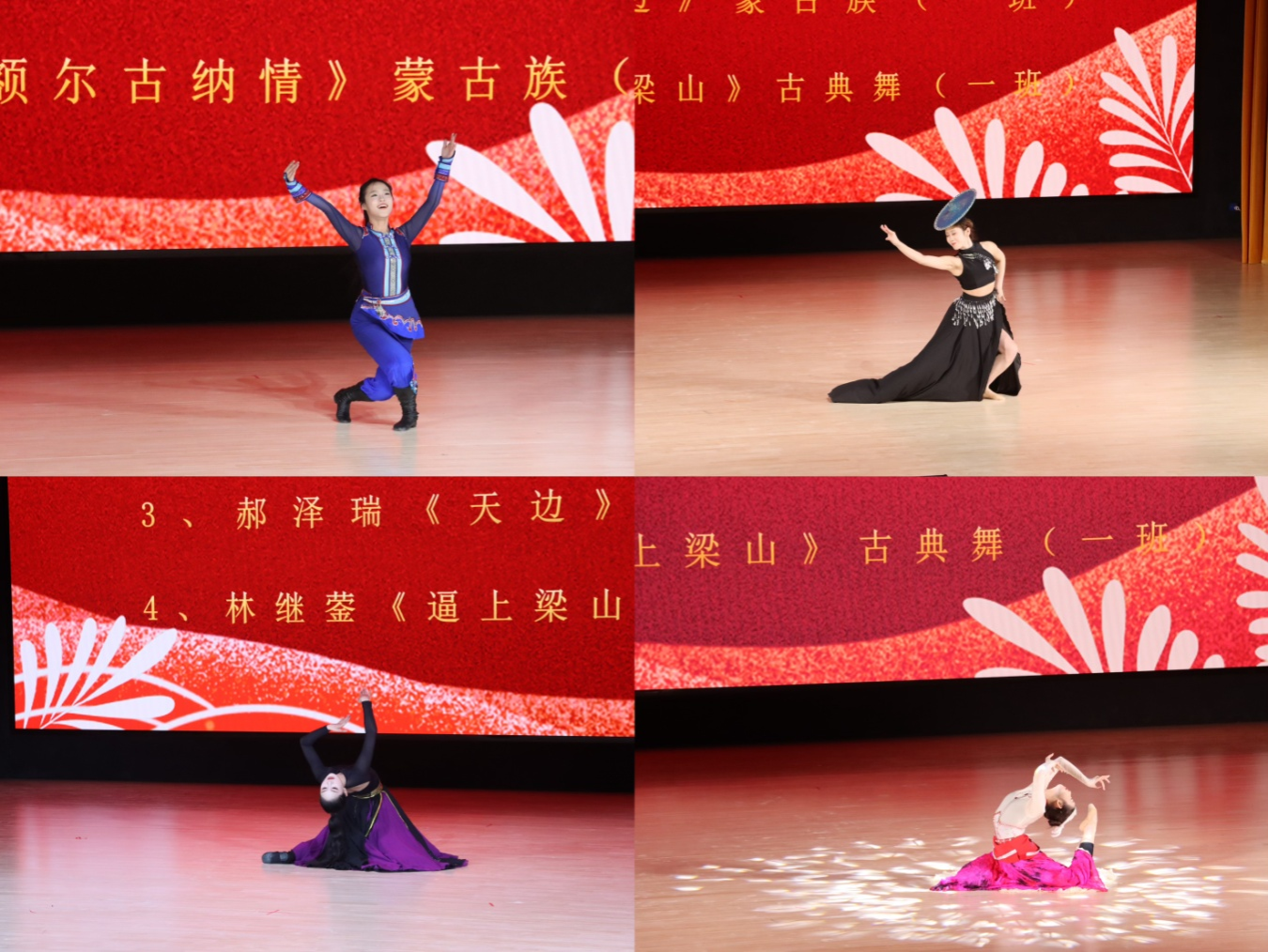 第五篇章的综合剧目展示精彩纷呈,况淇同学的傣族舞《Black》、季子晗同学的古典舞《翩若惊鸿》、郝泽瑞同学的蒙古族舞《天边》以及林继蓥同学的古典舞《逼上梁山》,四部作品风格各异,均以其独特魅力征服了现场观众。
