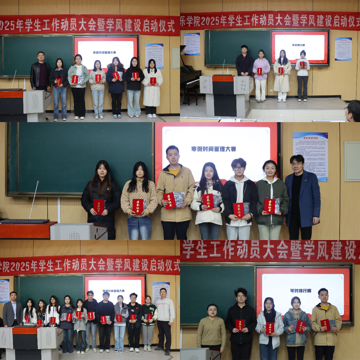 此次会议特别设置颁奖环节,对寒假时间管理大赛优胜者、琴时排行榜先进学生及文明宿舍获奖代表进行表彰。在激昂的乐曲中,获奖学子依次登台,从老师们手中接过镌刻着院徽的特制纪念品。时间管理大赛获奖者们以科学规划提升效率,将艺术追求融入日常点滴;琴时排行榜领跑者用坚持诠释“琴房里的汗水折射舞台光芒”,其晨练打卡的故事引发共鸣;文明宿舍代表则通过叠被如折谱、作息似和弦的生活美学,展现艺术生内外兼修的风采。学院通过树立典型,以鲜活榜样构建起立体化的榜样矩阵,让“见贤思齐、敦品励学”的清风浸润每个角落,激励学子在追求卓越的道路上步履铿锵。