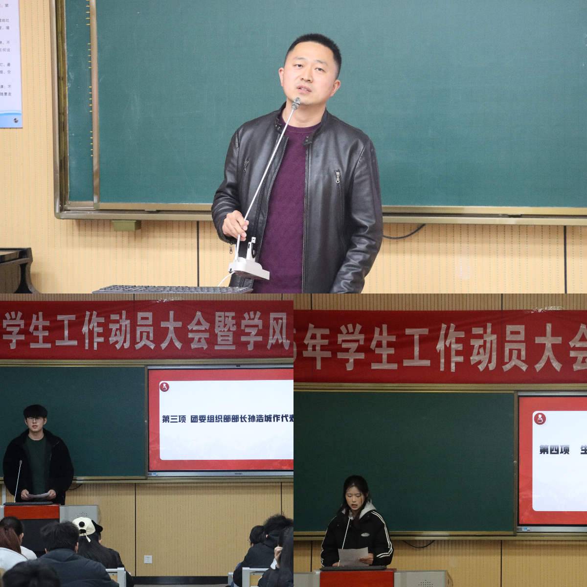 大会第二项,团委副书记牛培腾作动员讲话。他回顾了学院过去一年在学科竞赛、思政教育、社会实践等领域取得的丰硕成果。他号召全体学生干部践行“服务同学、成就自我”的初心使命,在审核评估关键期勇担责任,既要当好“上传下达的桥梁”,也要做好“遵规守纪的表率”。他以“厚德载物、追求卓越”寄语在场学子,强调“学生干部的身份是锤炼能力的宝贵平台”,鼓励大家以省优干、国家奖学金获得者为标杆,在学业与工作中实现双赢。