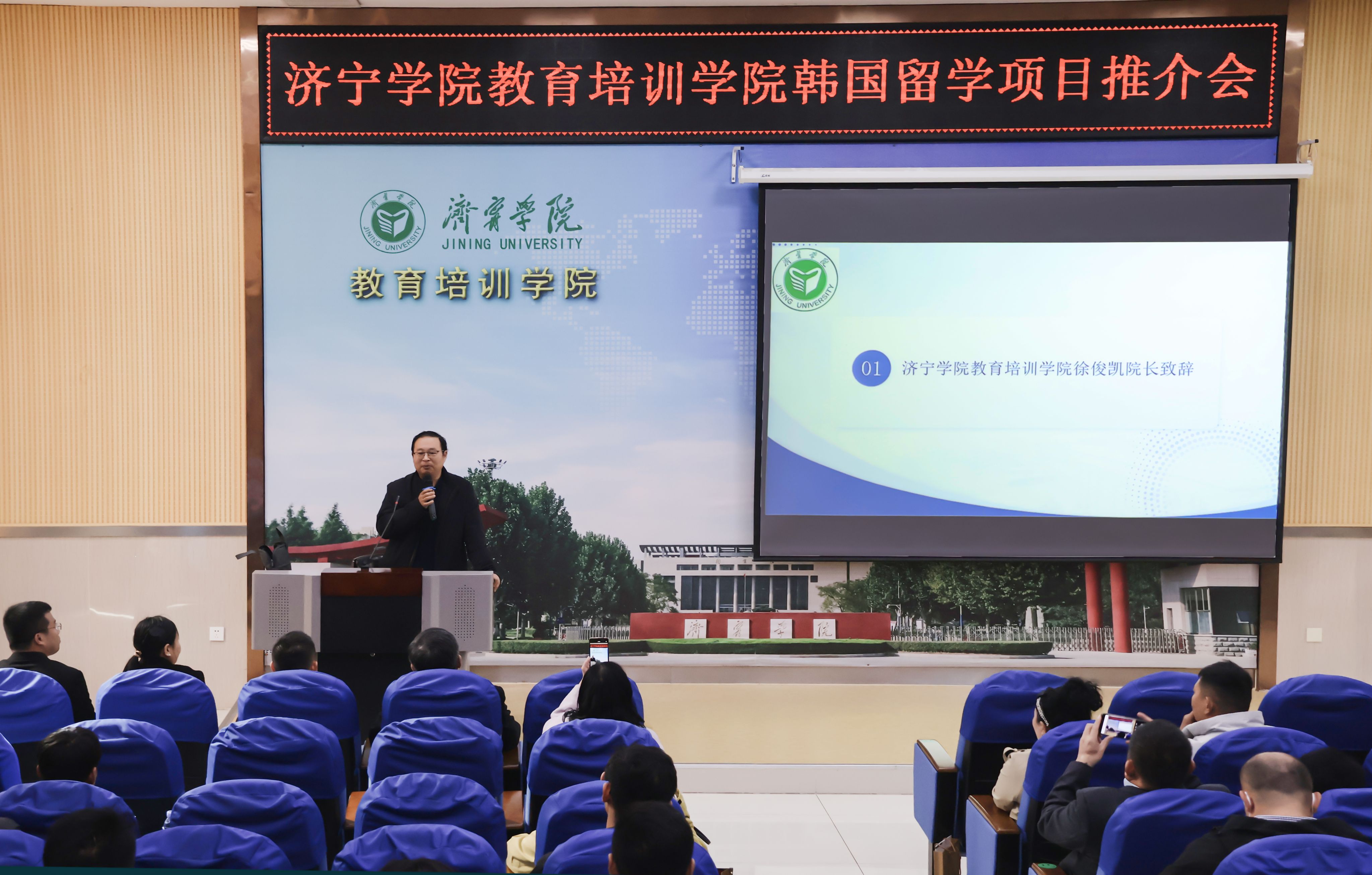 推介会伊始,教育培训学院院长徐俊凯上台致辞。他强调,学院始终致力于搭建优质国际教育平台,韩国留学项目依托学院资源整合能力,聚焦学生多元化发展需求,旨在为合作机构与学子提供更便捷、更专业的留学通道。他的发言为在场嘉宾勾勒出项目的发展愿景,也传递出学院深耕国际教育领域的决心。