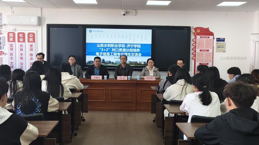 3月26日,物理与电子工程学院副院长岳现房、学术副院长田涛、电子工程系副主任余道淳一行赴山东水利职业学院开展“3+2”对口贯通专业人才培养座谈交流,山东水利职业学院信息工程系主任黄鲁新、专业教师及电子信息工程专本贯通班全体学生参加座谈。