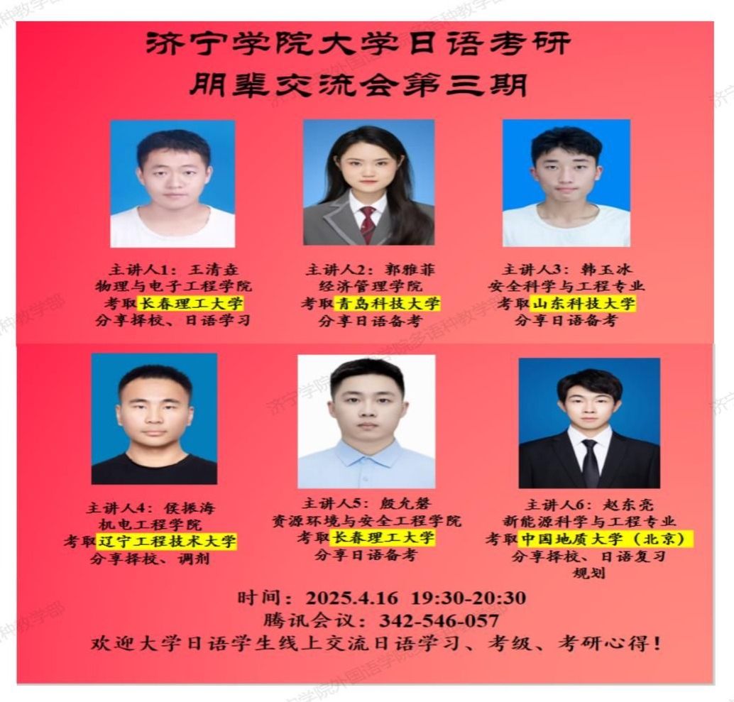 4月16日晚,外国语学院多语种教学部主办的“大学日语考研朋辈交流会第三期”在线上顺利举行。本次活动旨在为备战考研的大学日语学生提供经验分享与交流平台,吸引了全校大学日语在校生参与。交流会由六位成功考研的大四学生担任主讲人,他们分别来自不同学院,结合自身经历,为同学们带来了宝贵的考研经验。多语种教学部主任张金霞主持了本次活动。
