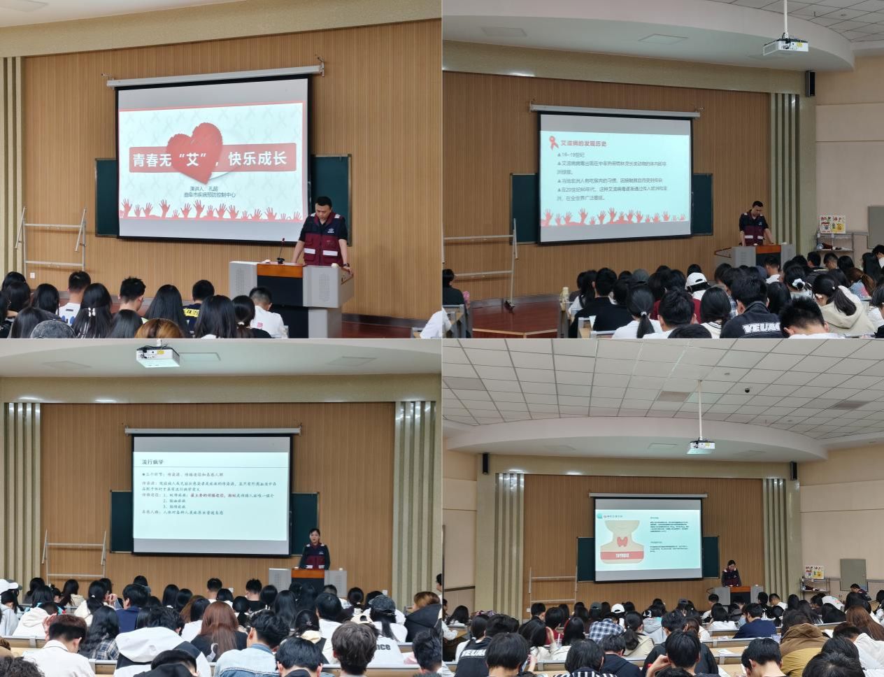 孔超以《青春无“艾”,快乐成长》为题,系统讲解了艾滋病的发现历史、病毒特性及全球流行现状,重点分析了性接触、血液和母婴传播三大途径,并结合大学生群体感染案例,详细介绍了艾滋病的预防措施、检测治疗方式及暴露后用药方案。他通过播放宣传视频,呼吁学生增强自我保护意识,科学防范艾滋病。