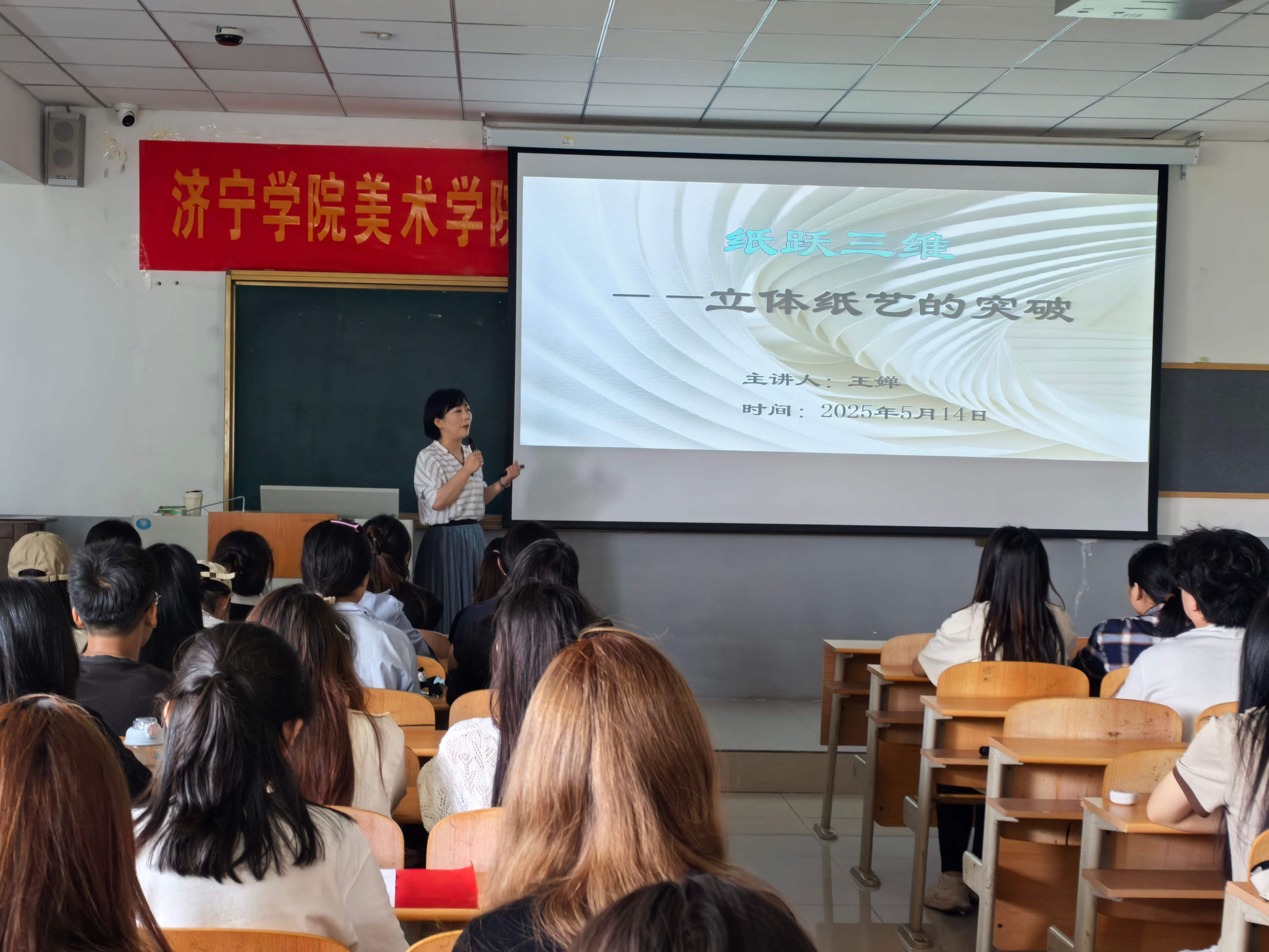 5月14日上午,美术学院邀请济宁一中教师王婵作“纸跃三维——立体纸艺的突破”主题讲座,美术学专业教师、2023级、2024级美术学同学参与,讲座由美术学教研室主任陈方媛主持。