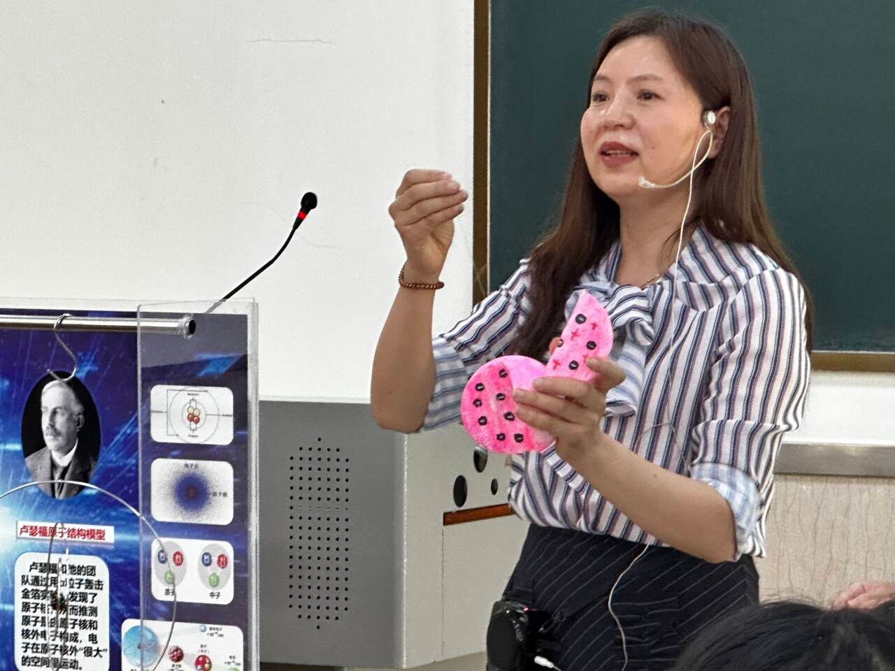 在现场,王慧演示了部分教具的使用和一些创新实验,学生积极参与其中。为当堂巩固教学设计的相关原理,王慧领着学生进行了听评课的讨论,整场讲座在积极的互动中圆满结束。