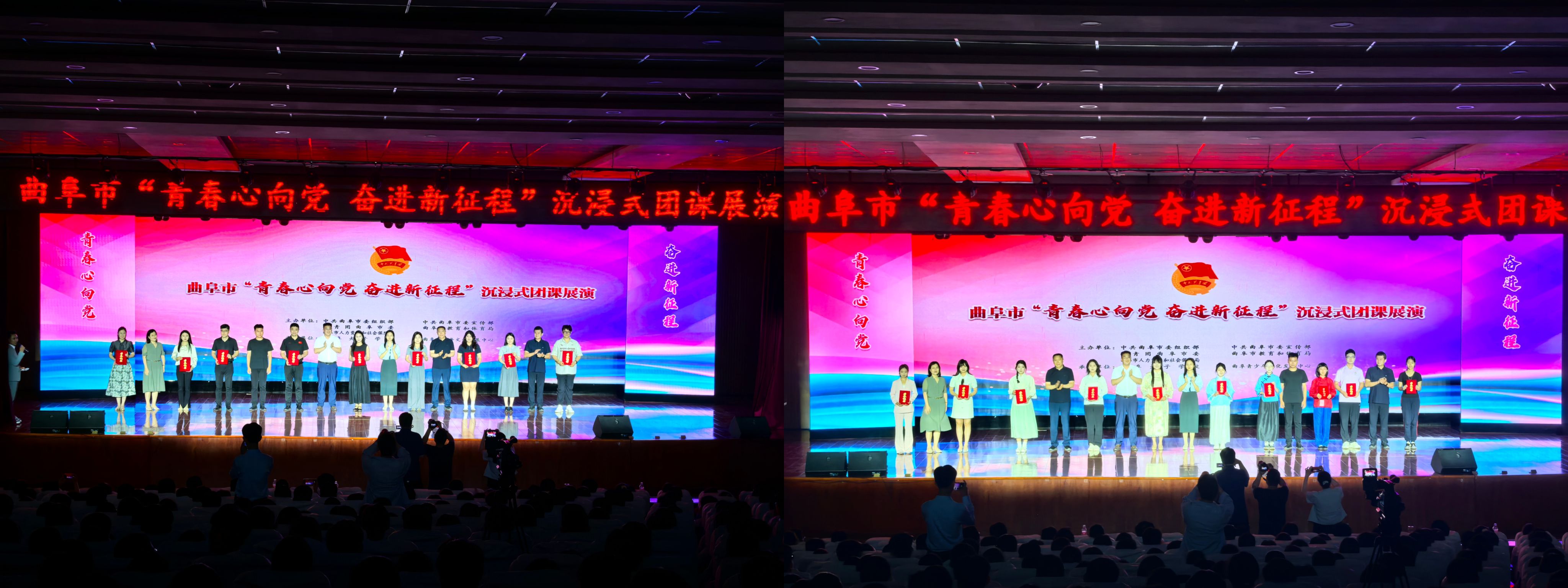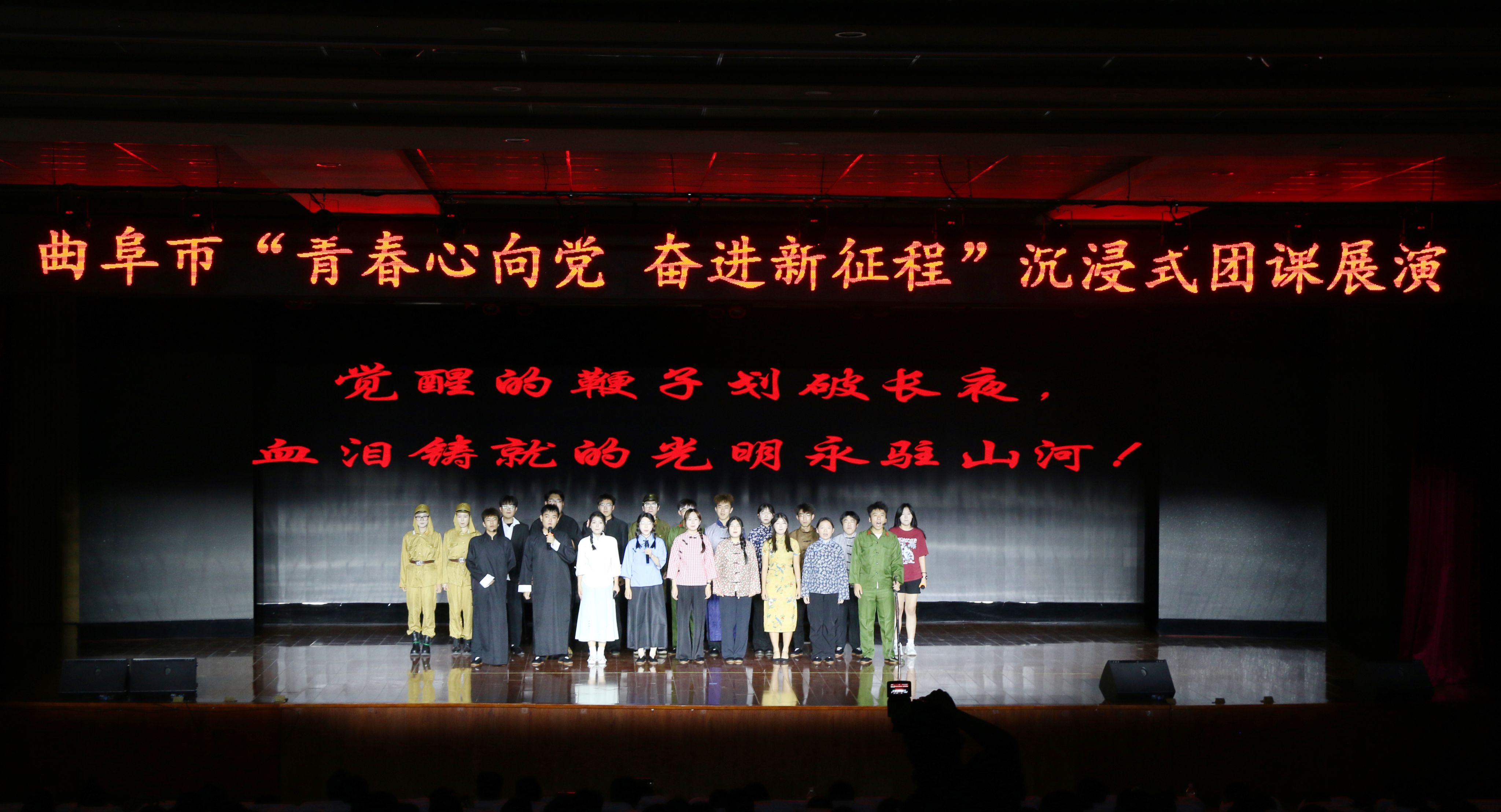 为深入学习宣传贯彻党的二十大和党的二十届三中全会精神,落实“党建带团建”工作要求,教育团员青年坚定理想信念、厚植家国情怀,激励团员青年在强国建设、民族复兴伟业中挺膺担当,近日,团市委联合市委组织部、市委宣传部、市教体局、市人社局在曲阜夫子学校举办曲阜市“青春心向党奋进新征程”沉浸式团课展演。各联办单位相关负责同志,各基层团(工)委书记和学校团组织负责人,曲阜夫子学校团员青年代表800余人参加活动。马克思主义学院话剧《放下你的鞭子》受邀参演。