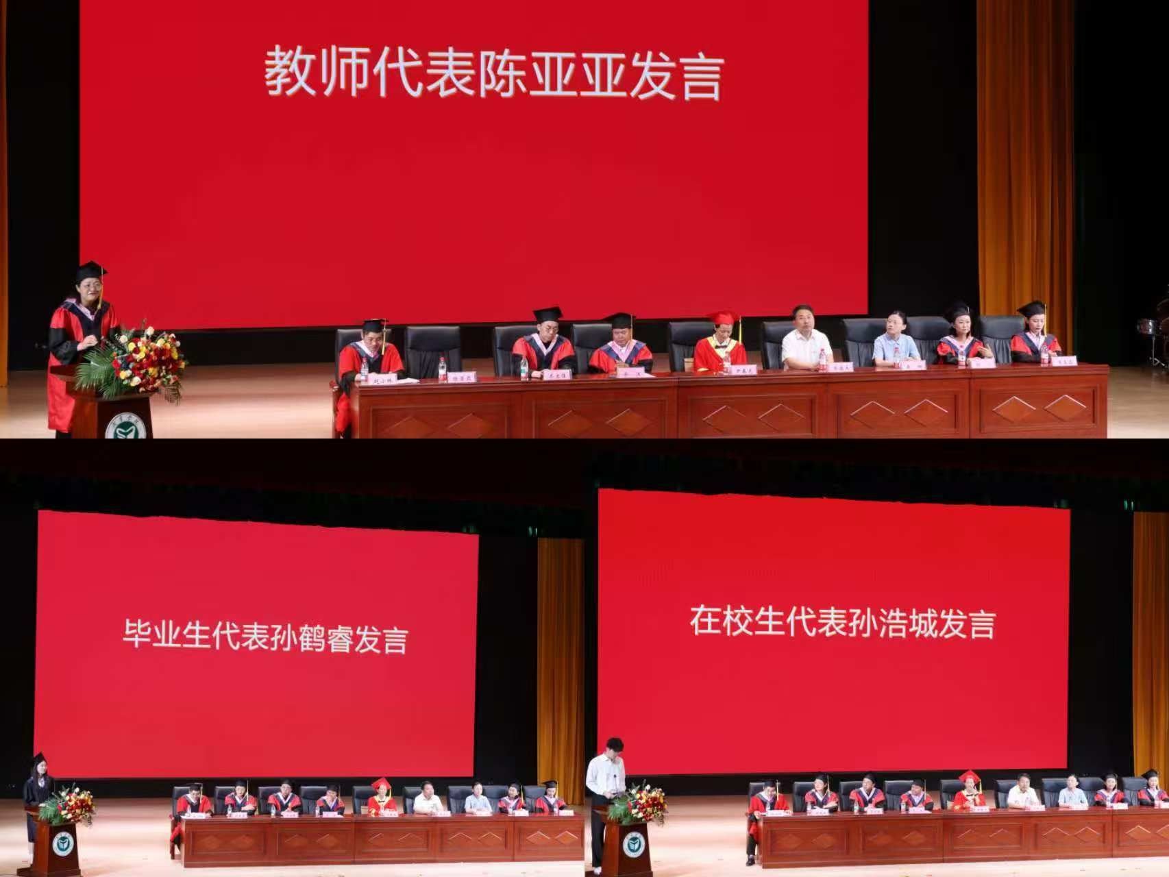 教师代表陈亚亚、毕业生代表孙鹤睿、在校生代表孙浩城依次上台发言。一声声祝福、一缕缕牵挂,蕴含着老师同学深情的关怀和由衷的期盼,愿同学们在青春的赛道上奋力奔跑,跑出当代青年的最美风采。