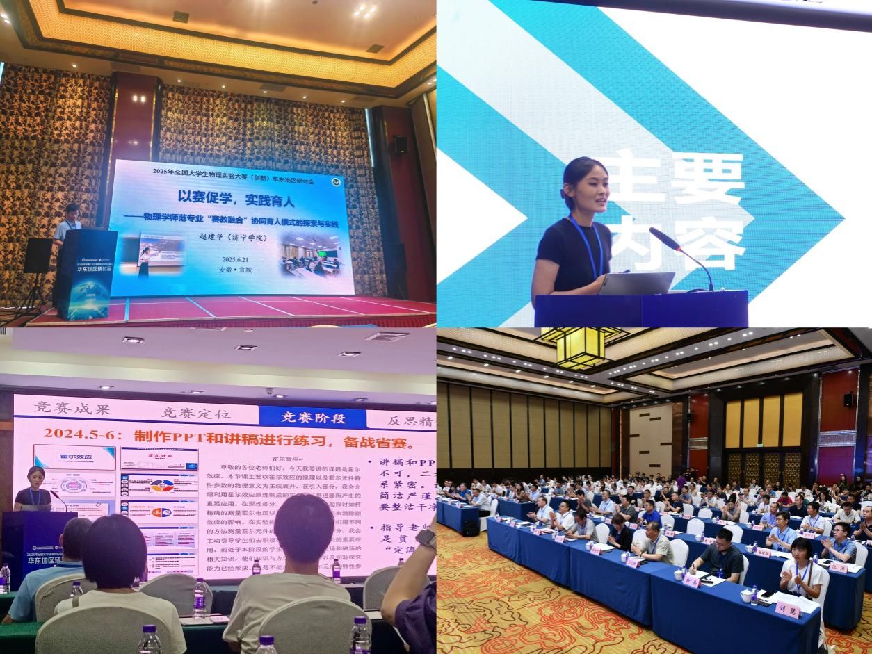 6月20日至22日,由全国大学生物理实验竞赛(创新)组委会、国家级实验教学示范中心联席会物理学科组主办,合肥工业大学物理学院承办的2025年全国大学生物理实验竞赛(创新)华东地区研讨会在安徽宣城成功举办。本次研讨会吸引了来自复旦大学、浙江大学、上海交通大学和中国科技大学等华东地区及以外的30余所高校的160余位专家学者、一线教师及学生代表,以及相关企业代表参会,围绕物理实验竞赛创新、物理专业人才培养等核心议题展开深入研讨。物理与电子工程学院物理科学系主任赵建华,以及物理学师范专业学生、2024年全国大学生物理实验竞赛(创新)讲课类一等奖获得者刘佳琪,受邀参会并分别作分会邀请报告和学生分享报告。