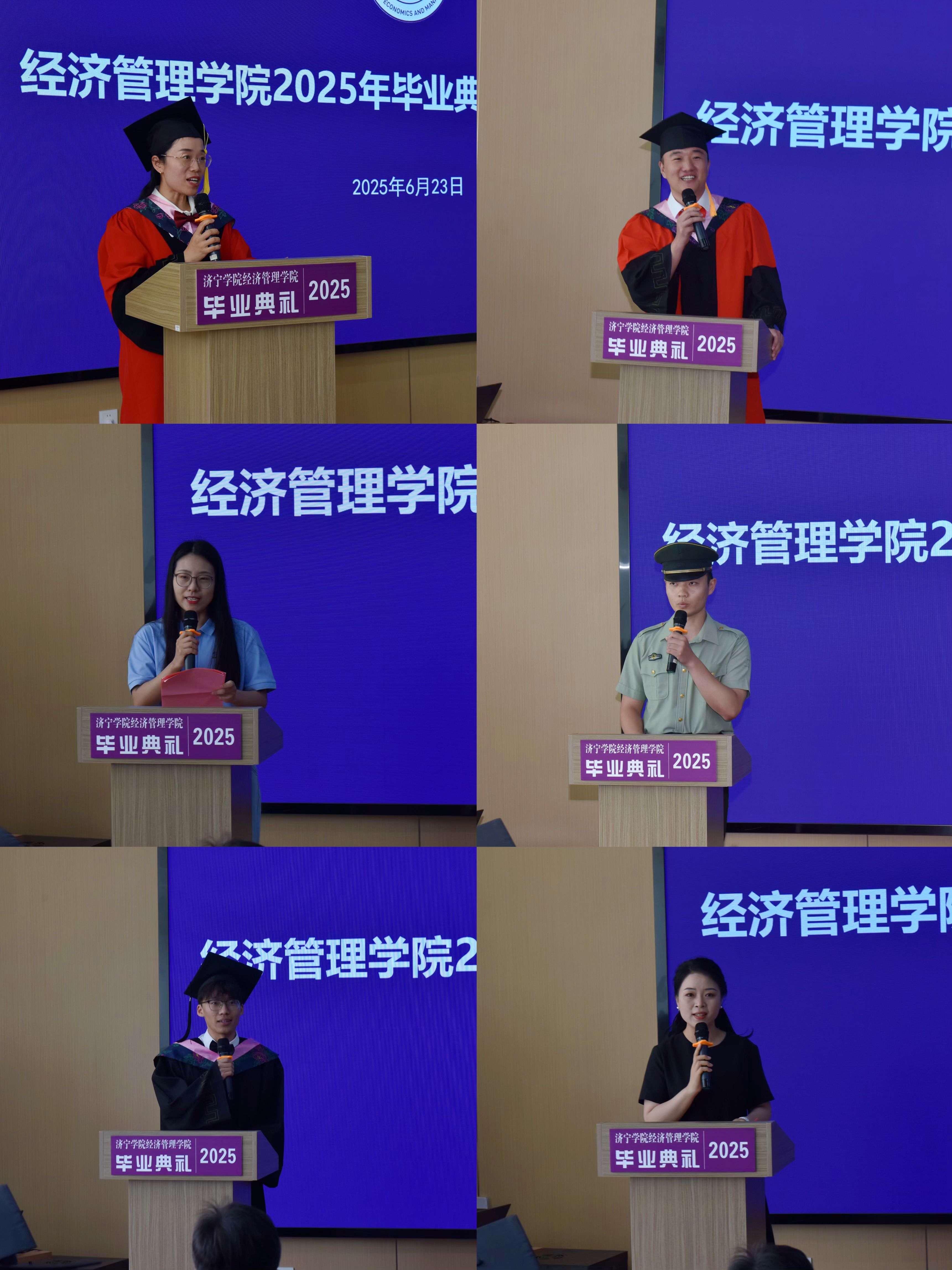教师代表周杨结合自身成长经历,运用经济学模型送上三条毕业寄语,一是用“博弈论”对抗内卷,用比较优势实现“帕累托最优”;二是用“行为经济学”接纳失败,允许自己“有限理性”;三是用“长期增长模型”看待人生,警惕“路径依赖”。退役士兵毕业生代表周玉发分享了从校园到军营的成长经历,呼吁同学们积极响应国家号召,踊跃参军,为国防事业贡献青春力量。毕业生代表李晨阳表达了对母校和师长的感恩之心,号召同学们肩负时代使命、立志挺膺担当,奋力书写无愧于母校、无愧于时代的青春华章。
