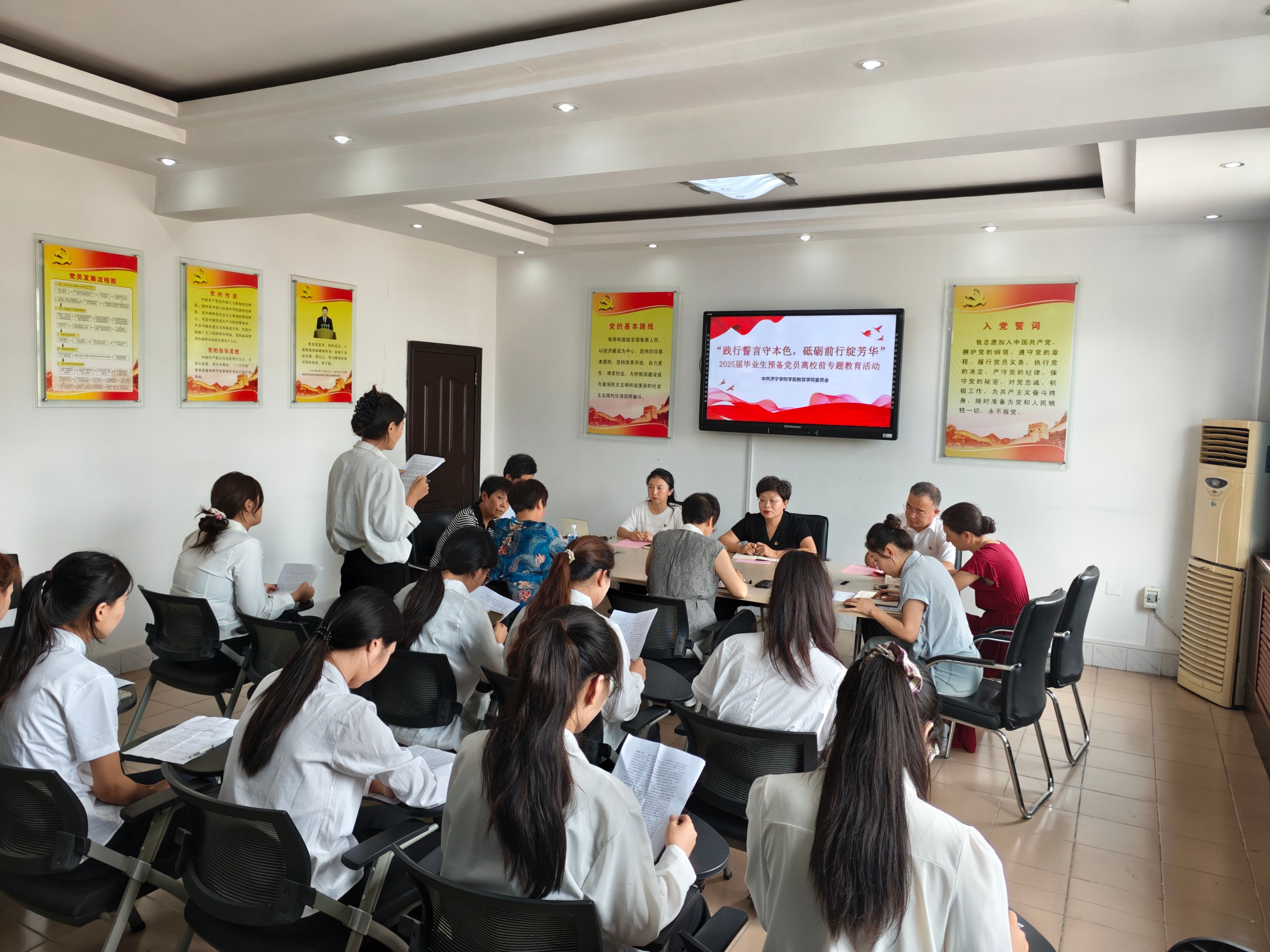 6月28日下午,学前教育学院学生党支部在党员活动室举行了“践行誓言守本色,砥砺前行绽芳华”2025届毕业生预备党员离校前专题教育活动。党委副书记丰琳琳、入党介绍人、学生党支部全体党员和11名预备党员参加了此次活动,活动由学院学生党支部书记于思思主持。