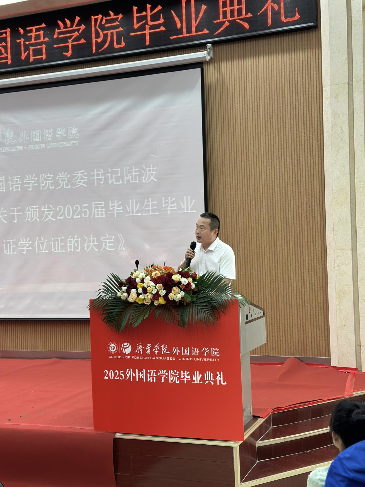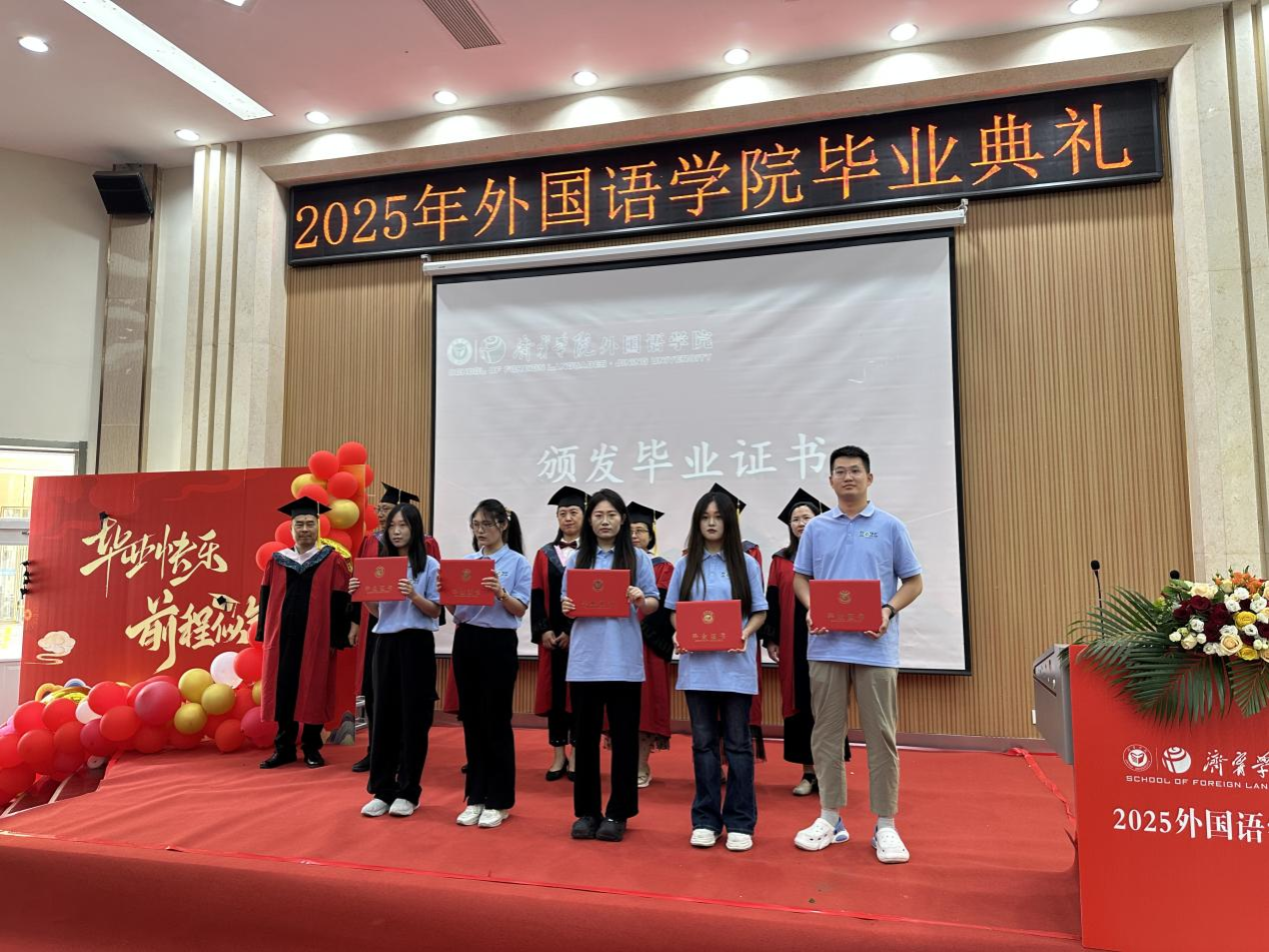 毕业典礼上,陆波宣读外国语学院2025届本科学位授予决定、毕业证书颁发决定。教师代表为全体毕业生颁发了毕业证书,为学位获得者拨穗并授予学士学位。同学们依次上台,拨穗、握手、拥抱、合影,浓浓师生情,依依离别意。