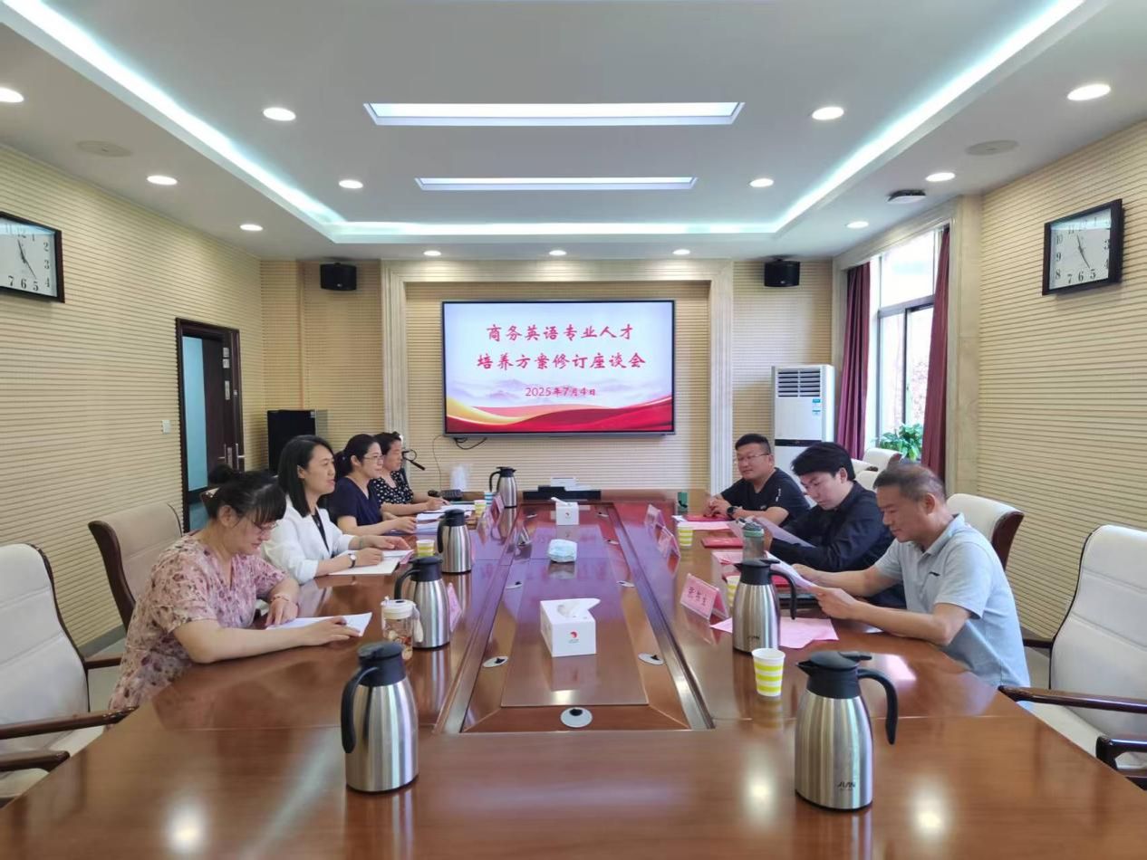 为深入贯彻落实应用型人才培养目标,优化商务英语专业建设路径,7月4日上午,外国语学院召开“商务英语专业人才培养方案修订座谈会”,邀请了山东永安智能有限公司总经理侯仰琦、福运通文化发展(山东)有限责任公司总经理王苏、济宁迎丰国际贸易有限公司总经理张书生参与研讨,学院副院长、商务英语专业负责人张颖、商务英语系主任李霄露、副主任桑春芳及骨干教师马晓丽参加会议。