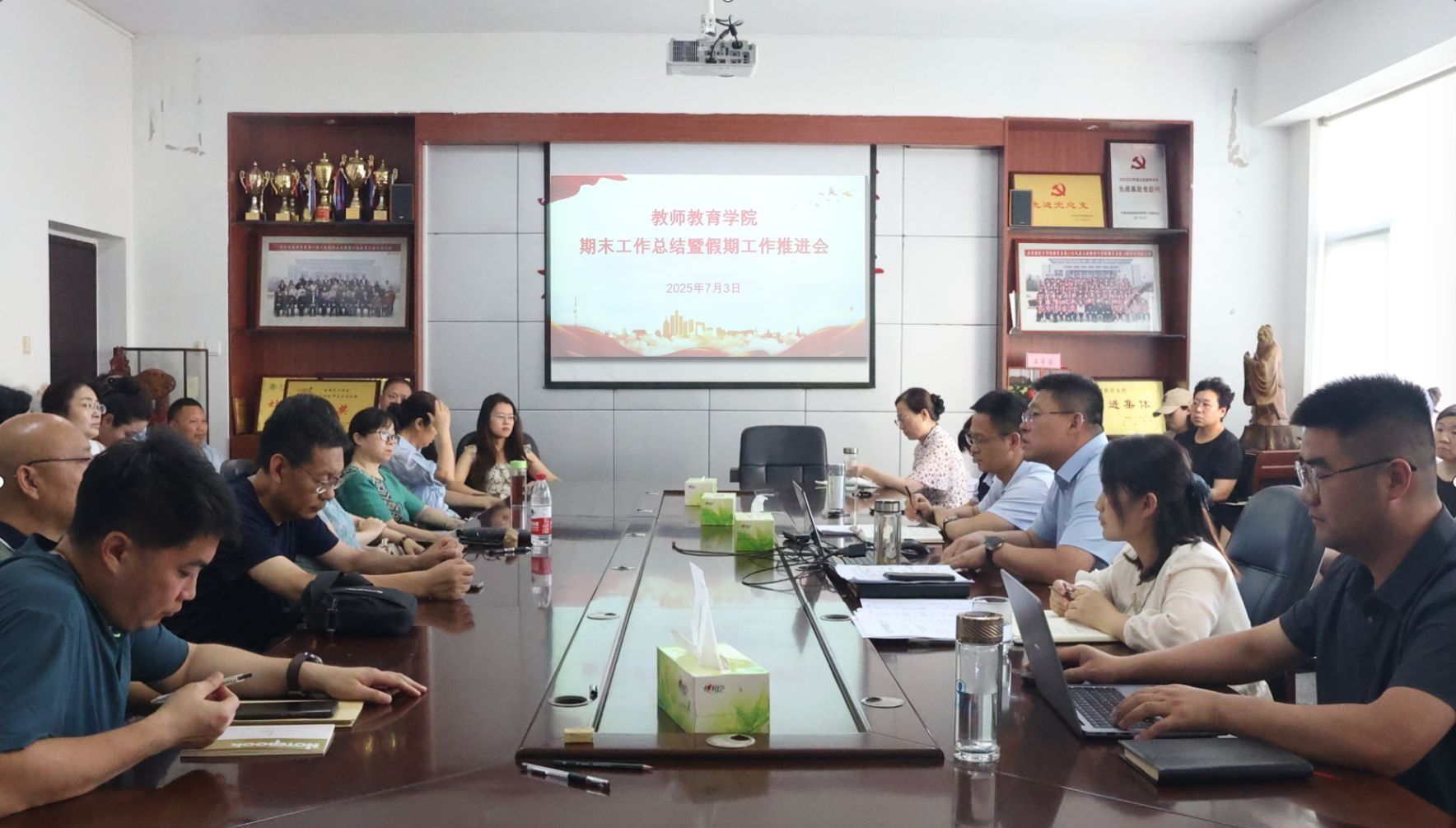 7月3日,教师教育学院于2号楼A211会议室举行了2024-2025学年第二学期期末工作总结及假期工作推进会。本次会议由学院党委书记刘勇主持,院长曹光海、副院长贾英侠、学术副院长张祥军以及全体教职工出席。