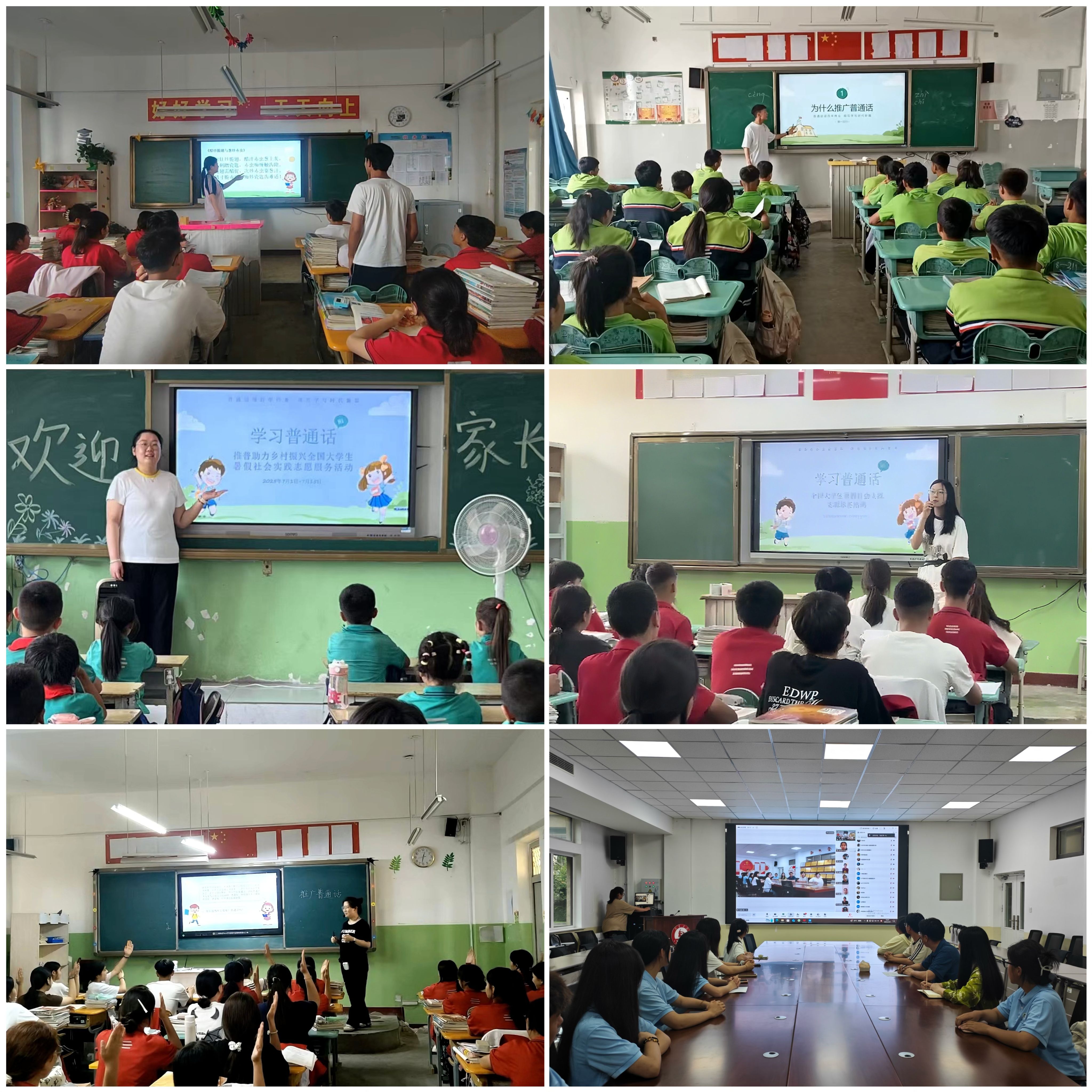 马克思主义学院的鞠一凡在实验中学高一十五班开启了第一次推普活动,课堂上,她以生动有趣的方式引入普通话知识点燃了同学们的学习热情,为整个推普活动拉开了精彩的序幕。喀什大学阿卜杜热合曼在杏坛中学初一三班开展了第二次推普活动,他结合自身经历,向同学们讲述了学好普通话的重要性,让大家对普通话学习有了更深刻的认识。第三次推普活动由人文与传播学院的张欣在实验小学三年级二班进行,面对活泼可爱的小学生,张欣采用了寓教于乐的方式,通过儿歌、小故事等形式,让孩子们在轻松愉快的氛围中感受普通话的魅力。人文与传播学院的胡佳兴在实验中学二十班开展第四次推普活动,他针对中学生的特点,设计了丰富多样的语言互动环节,进一步提升了同学们的普通话表达能力。第五次推普活动由人文与传播学院的张雨欣在实验中学高一二十二班进行,她结合高中学生的学习需求,深入讲解了普通话在学业发展和未来职业规划中的重要作用,激发了同学们学好普通话的动力。马克思主义学院的鞠一凡、刘宸赫通过连线新疆学生,开展了第六次推普活动,此次活动不仅有英吉沙实验中学高一十五班的学生参与,暑期三下乡部分学生代表也积极加入其中。跨地域的连线,让普通话学习的热情跨越了山海,传递到了每一个参与活动的学生心中。